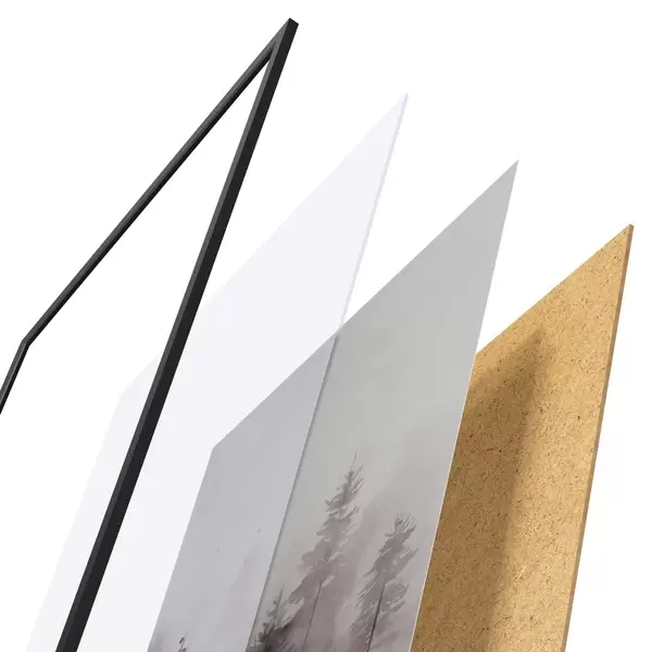 De poster bestaat uit een frame, plexiglas, geprinte afbeelding en spaanplaat achterkant. De poster kan meteen aan de muur worden gehangen dankzij de bevestigingen op de achterkant.