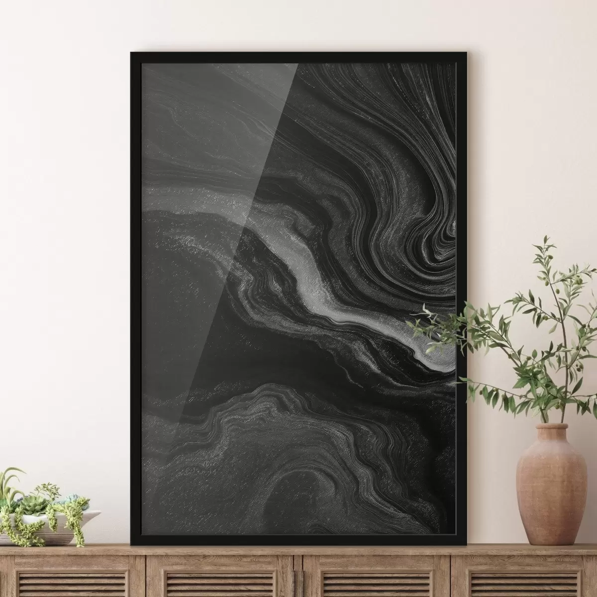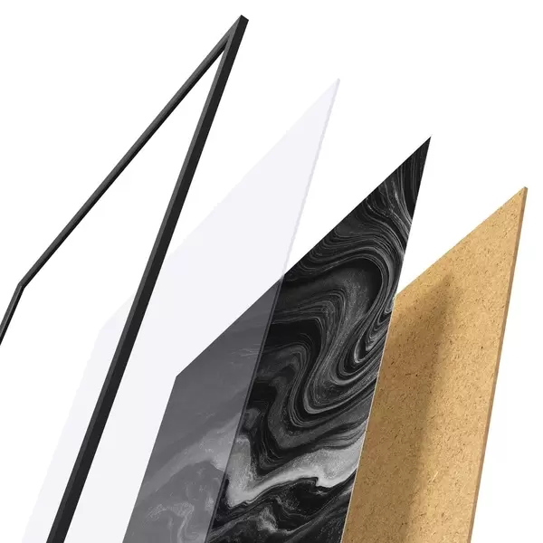 De poster bestaat uit een frame, plexiglas, geprinte afbeelding en spaanplaat achterkant. De poster kan meteen aan de muur worden gehangen dankzij de bevestigingen op de achterkant.