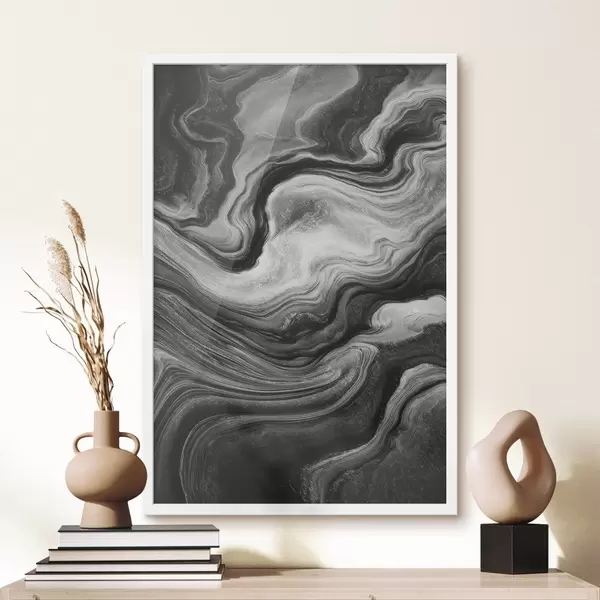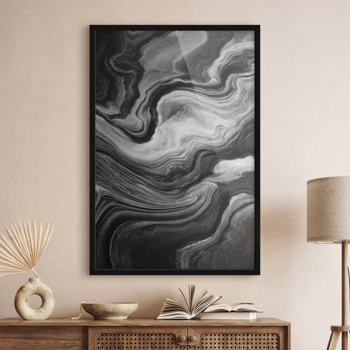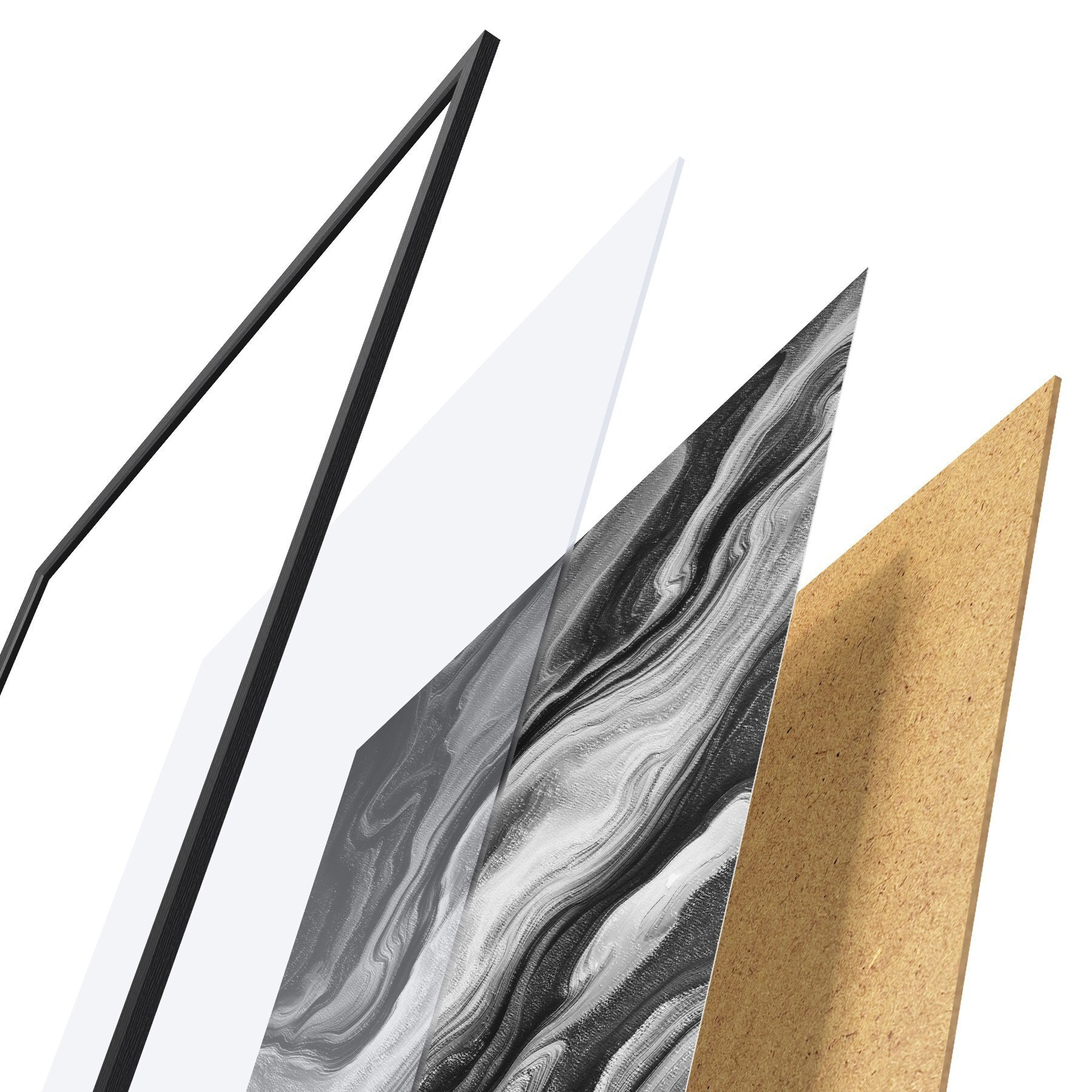 De poster bestaat uit een frame, plexiglas, geprinte afbeelding en spaanplaat achterkant. De poster kan meteen aan de muur worden gehangen dankzij de bevestigingen op de achterkant.