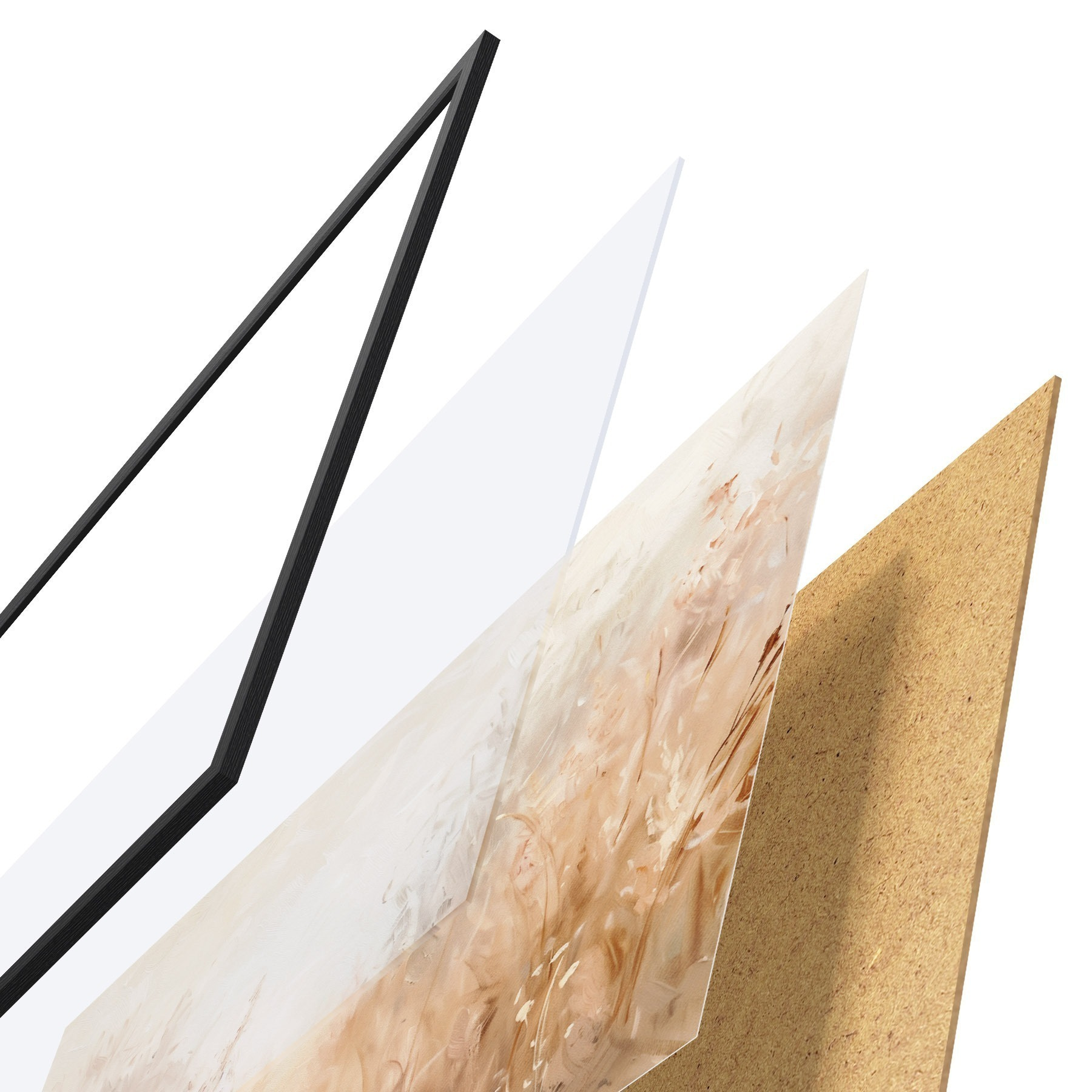 De poster bestaat uit een frame, plexiglas, geprinte afbeelding en spaanplaat achterkant. De poster kan meteen aan de muur worden gehangen dankzij de bevestigingen op de achterkant.