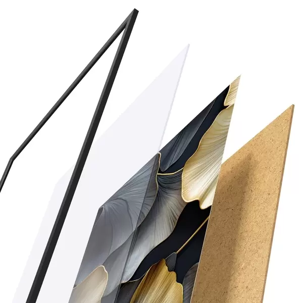 De poster bestaat uit een frame, plexiglas, geprinte afbeelding en spaanplaat achterkant. De poster kan meteen aan de muur worden gehangen dankzij de bevestigingen op de achterkant.