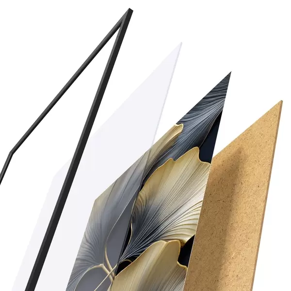 De poster bestaat uit een frame, plexiglas, geprinte afbeelding en spaanplaat achterkant. De poster kan meteen aan de muur worden gehangen dankzij de bevestigingen op de achterkant.
