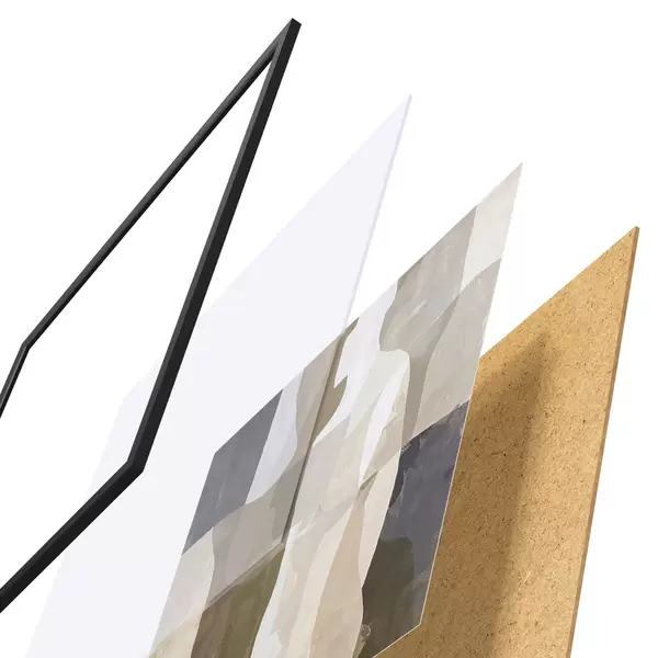De poster bestaat uit een frame, plexiglas, geprinte afbeelding en spaanplaat achterkant. De poster kan meteen aan de muur worden gehangen dankzij de bevestigingen op de achterkant.