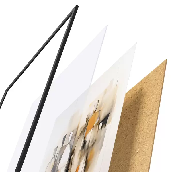 De poster bestaat uit een frame, plexiglas, geprinte afbeelding en spaanplaat achterkant. De poster kan meteen aan de muur worden gehangen dankzij de bevestigingen op de achterkant.
