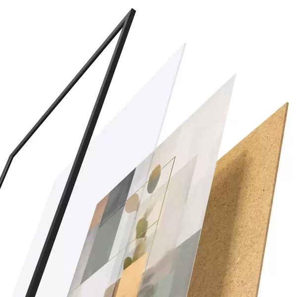 De poster bestaat uit een frame, plexiglas, geprinte afbeelding en spaanplaat achterkant. De poster kan meteen aan de muur worden gehangen dankzij de bevestigingen op de achterkant.