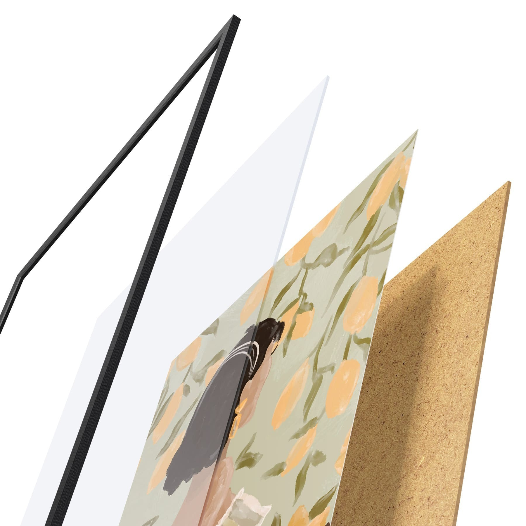 De poster bestaat uit een frame, plexiglas, geprinte afbeelding en spaanplaat achterkant. De poster kan meteen aan de muur worden gehangen dankzij de bevestigingen op de achterkant.