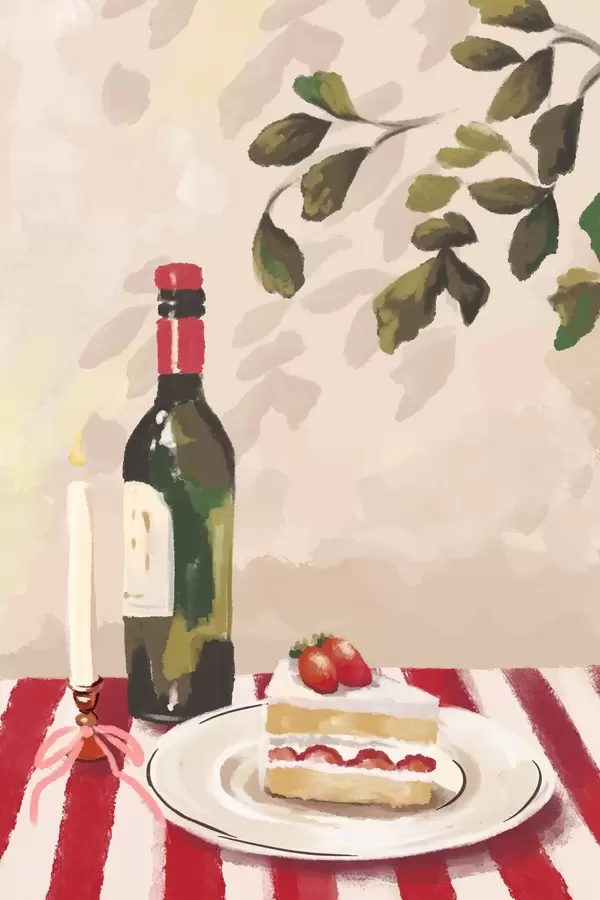 Poster Stilleven met wijn, kaars en cake f48024