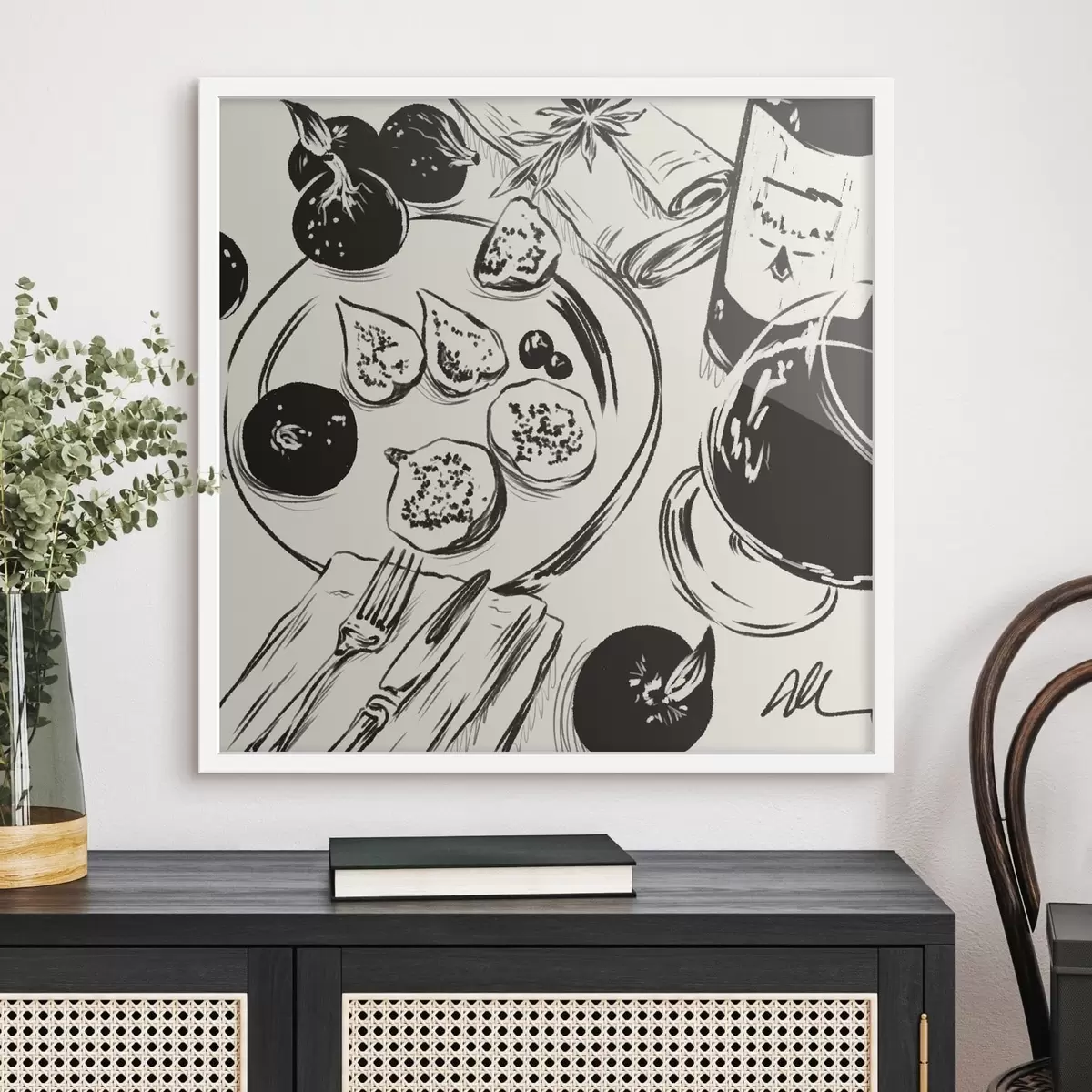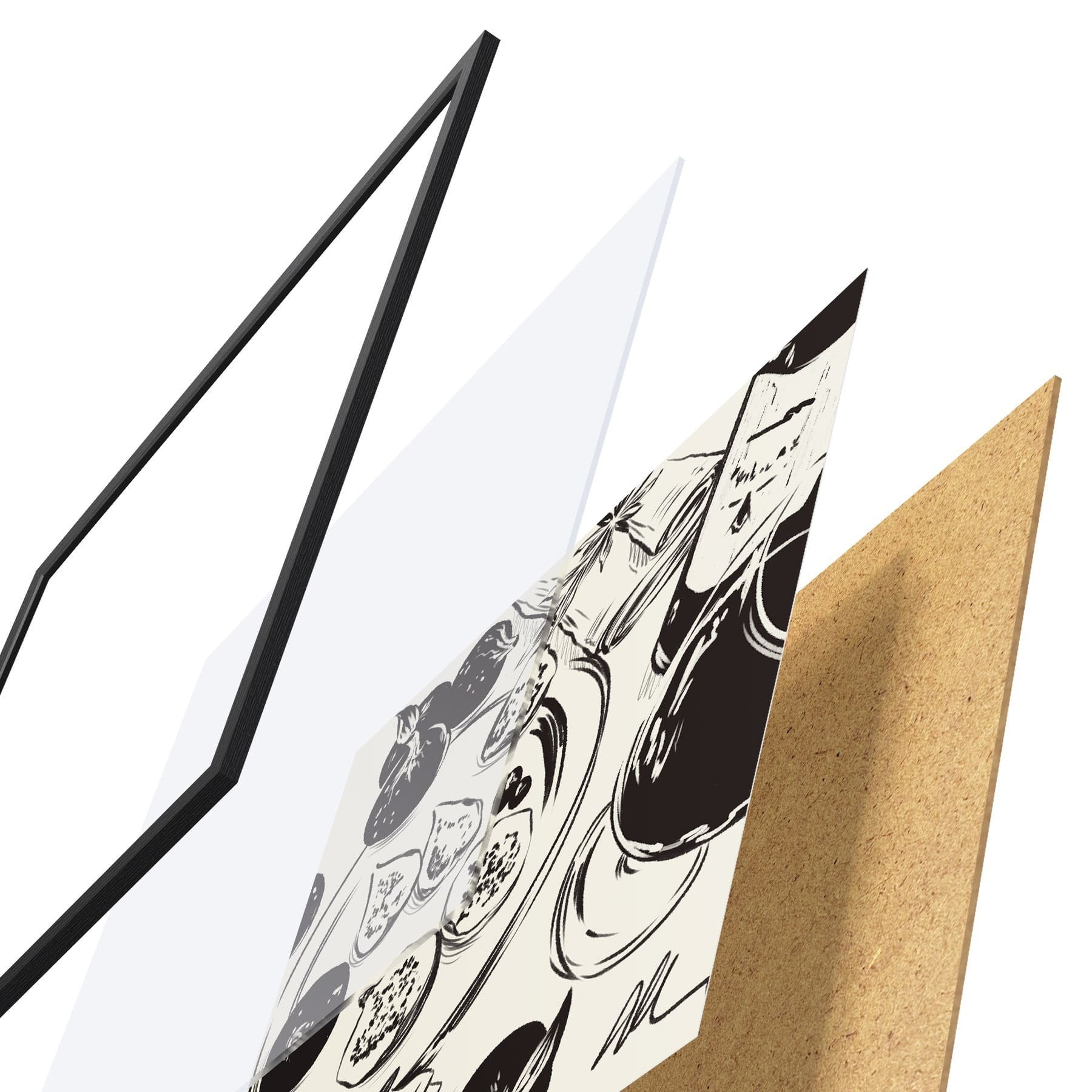 Poster Zwart-witte schets van een tafel met fruit en een glas f48030