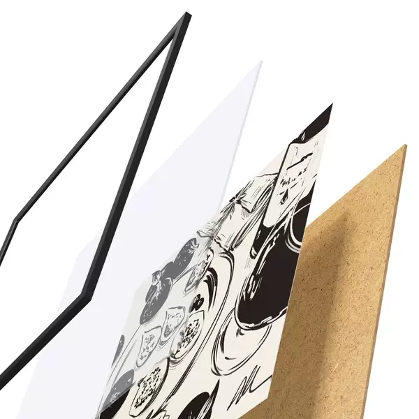 De poster bestaat uit een frame, plexiglas, geprinte afbeelding en spaanplaat achterkant. De poster kan meteen aan de muur worden gehangen dankzij de bevestigingen op de achterkant.