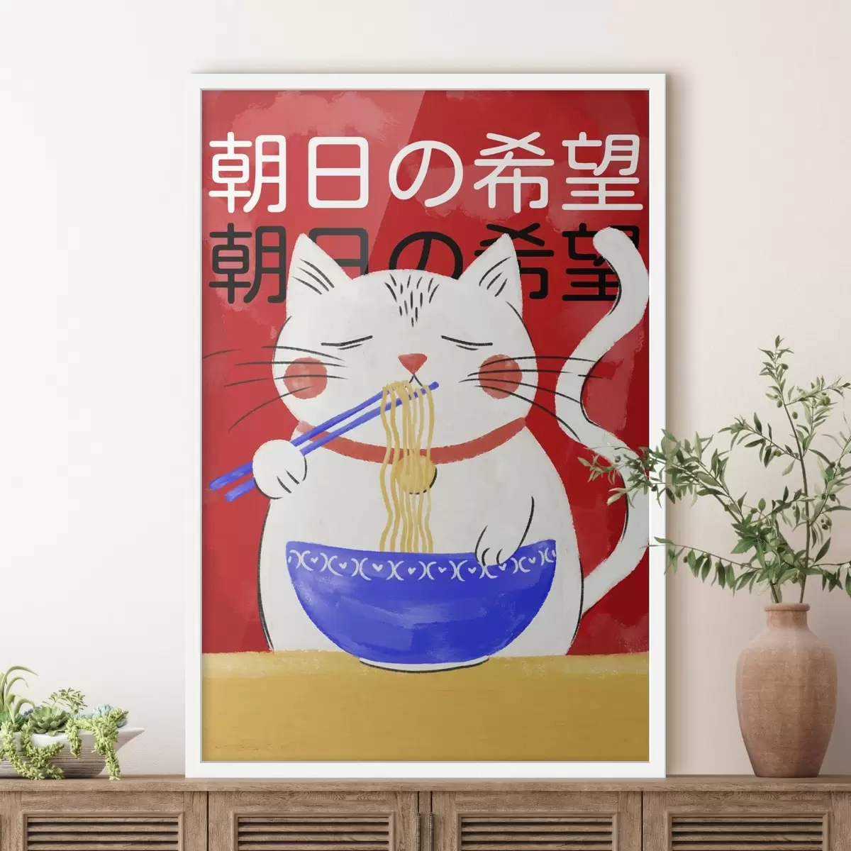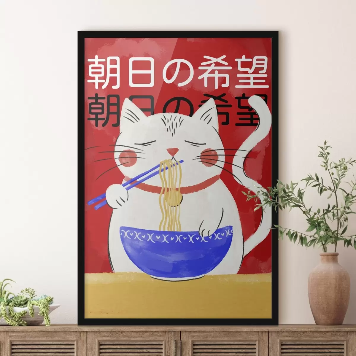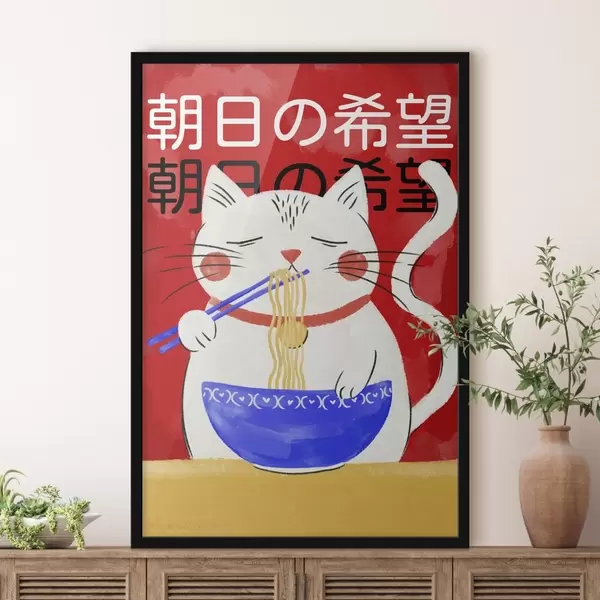 Poster Illustratie van een kat die noedels eet op een rode achtergrond f48031