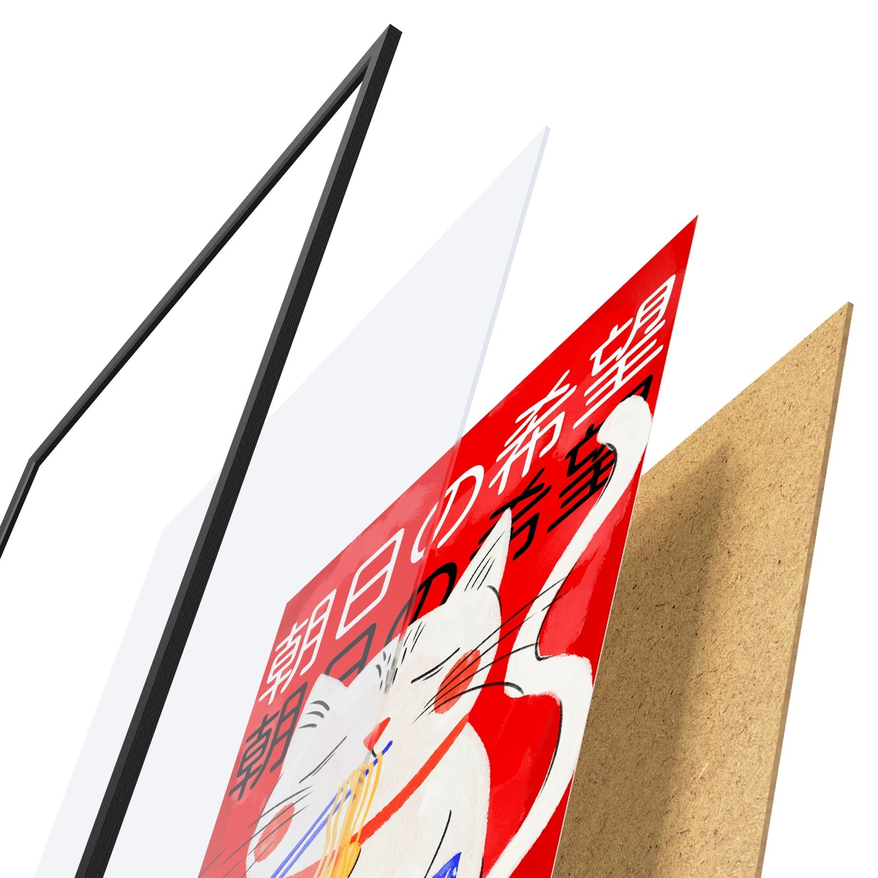 De poster bestaat uit een frame, plexiglas, geprinte afbeelding en spaanplaat achterkant. De poster kan meteen aan de muur worden gehangen dankzij de bevestigingen op de achterkant.