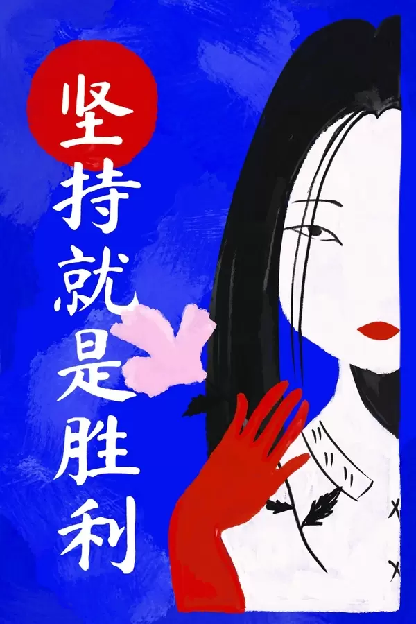 Poster Gestileerd vrouwenportret met blauwe achtergrond en tekst f48032