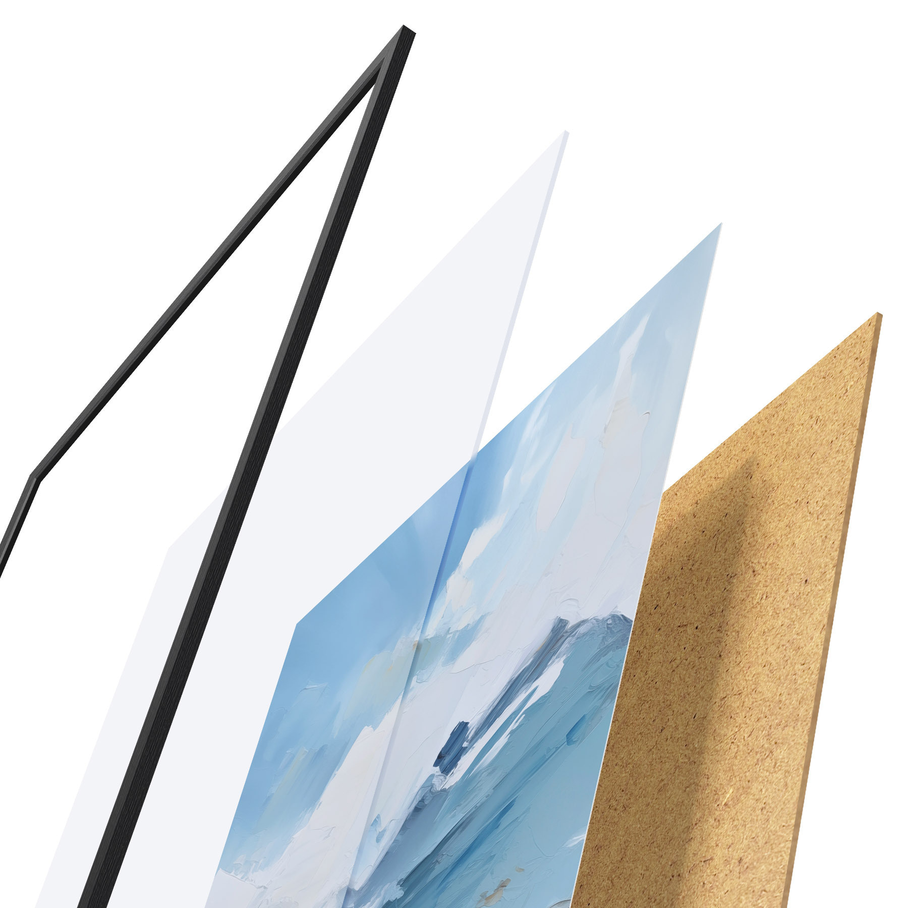 De poster bestaat uit een frame, plexiglas, geprinte afbeelding en spaanplaat achterkant. De poster kan meteen aan de muur worden gehangen dankzij de bevestigingen op de achterkant.