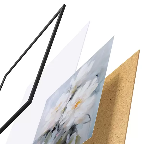 De poster bestaat uit een frame, plexiglas, geprinte afbeelding en spaanplaat achterkant. De poster kan meteen aan de muur worden gehangen dankzij de bevestigingen op de achterkant.