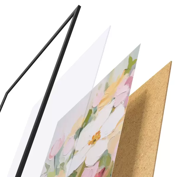 De poster bestaat uit een frame, plexiglas, geprinte afbeelding en spaanplaat achterkant. De poster kan meteen aan de muur worden gehangen dankzij de bevestigingen op de achterkant.