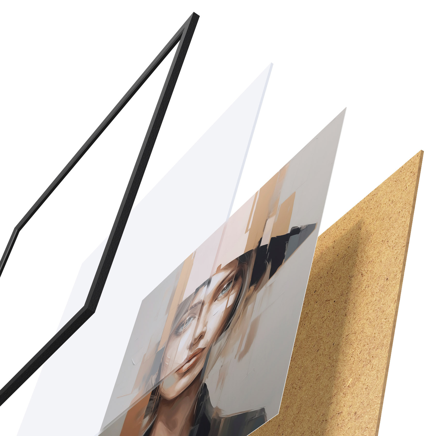 De poster bestaat uit een frame, plexiglas, geprinte afbeelding en spaanplaat achterkant. De poster kan meteen aan de muur worden gehangen dankzij de bevestigingen op de achterkant.