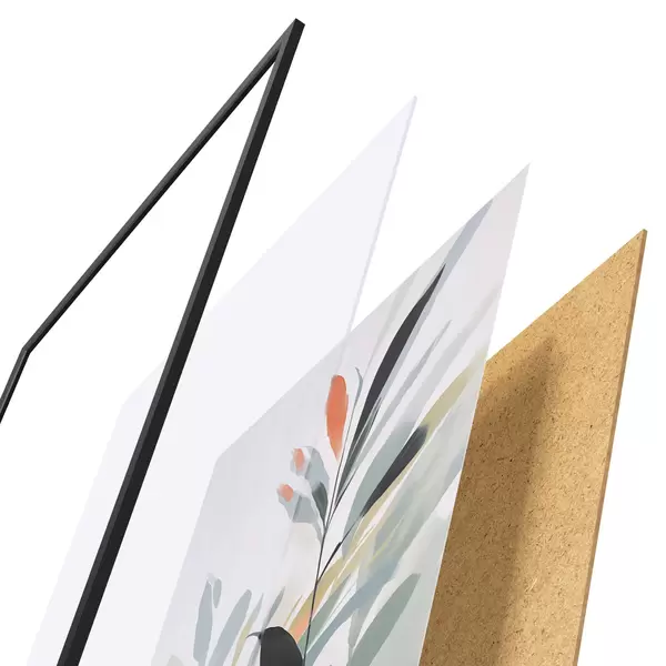 De poster bestaat uit een frame, plexiglas, geprinte afbeelding en spaanplaat achterkant. De poster kan meteen aan de muur worden gehangen dankzij de bevestigingen op de achterkant.