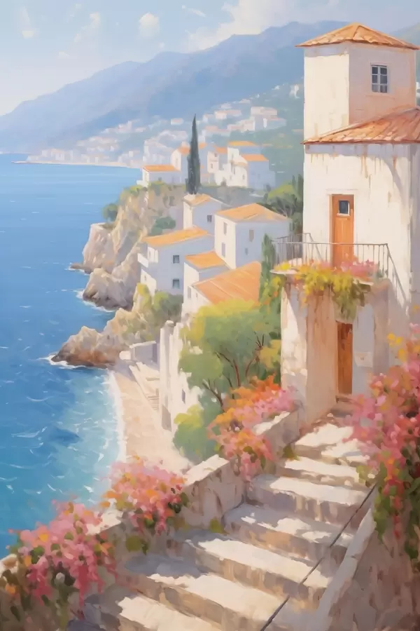 Poster impressionistisch dorpje aan een mediterrane klif N° f48060