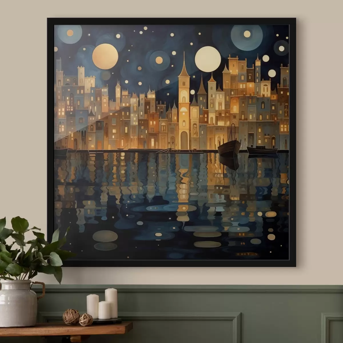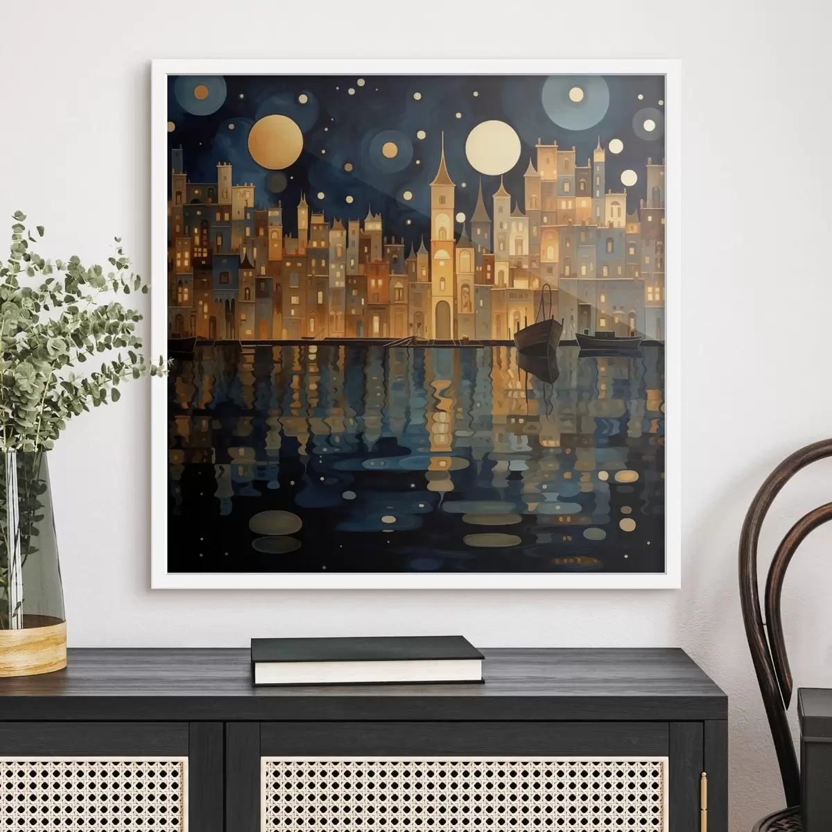 Poster grillige nachtstad aan het water N° f48063