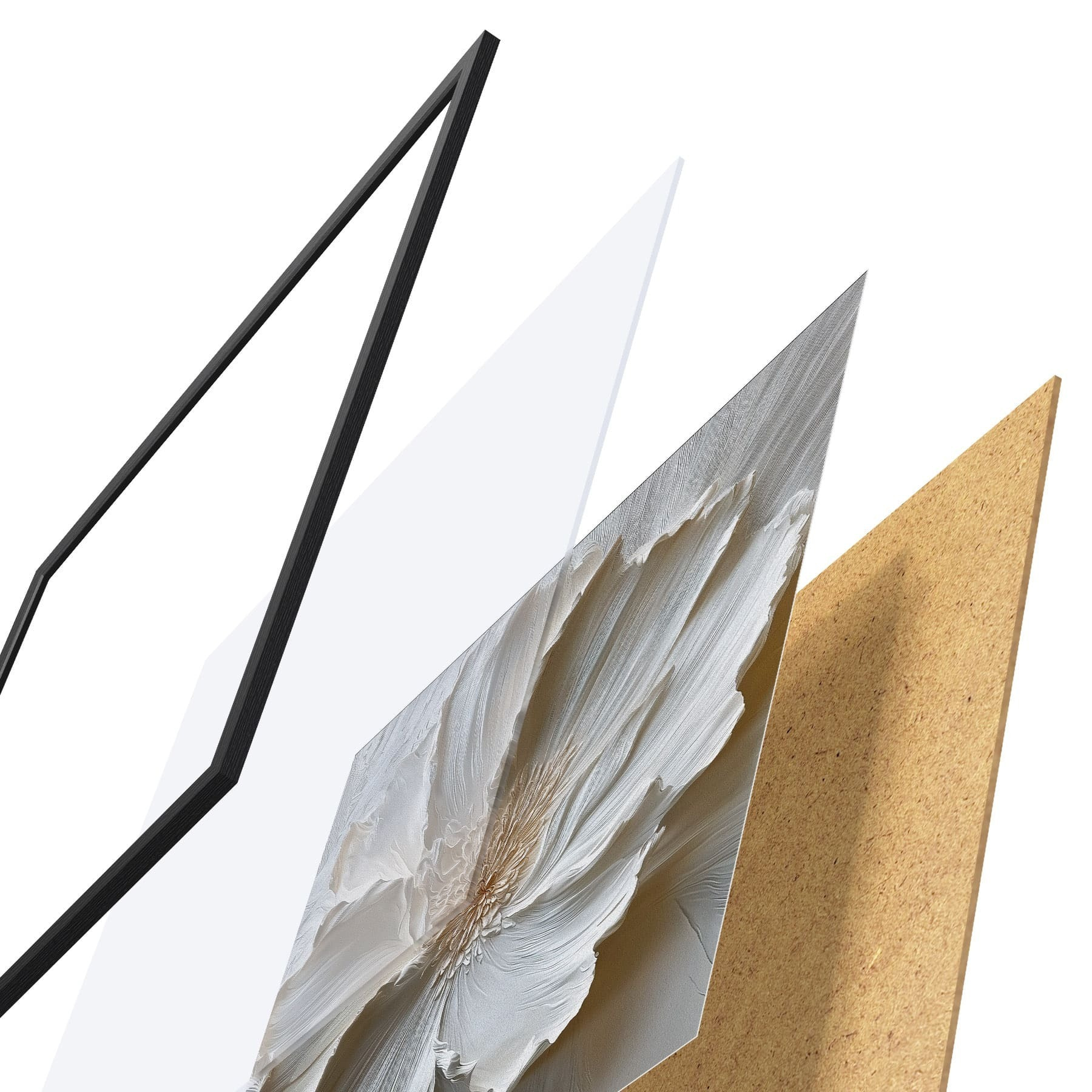 De poster bestaat uit een frame, plexiglas, geprinte afbeelding en spaanplaat achterkant. De poster kan meteen aan de muur worden gehangen dankzij de bevestigingen op de achterkant.