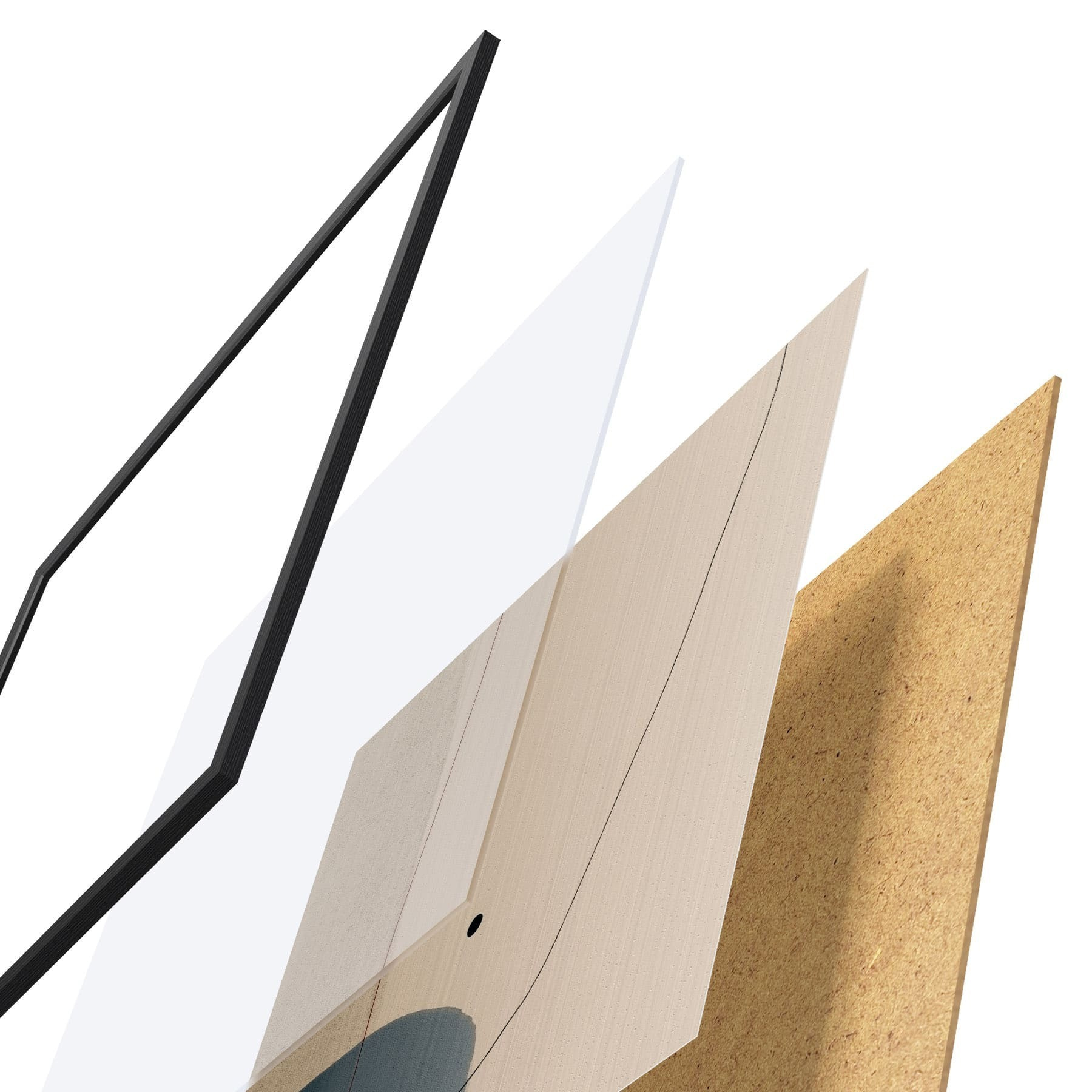 De poster bestaat uit een frame, plexiglas, geprinte afbeelding en spaanplaat achterkant. De poster kan meteen aan de muur worden gehangen dankzij de bevestigingen op de achterkant.