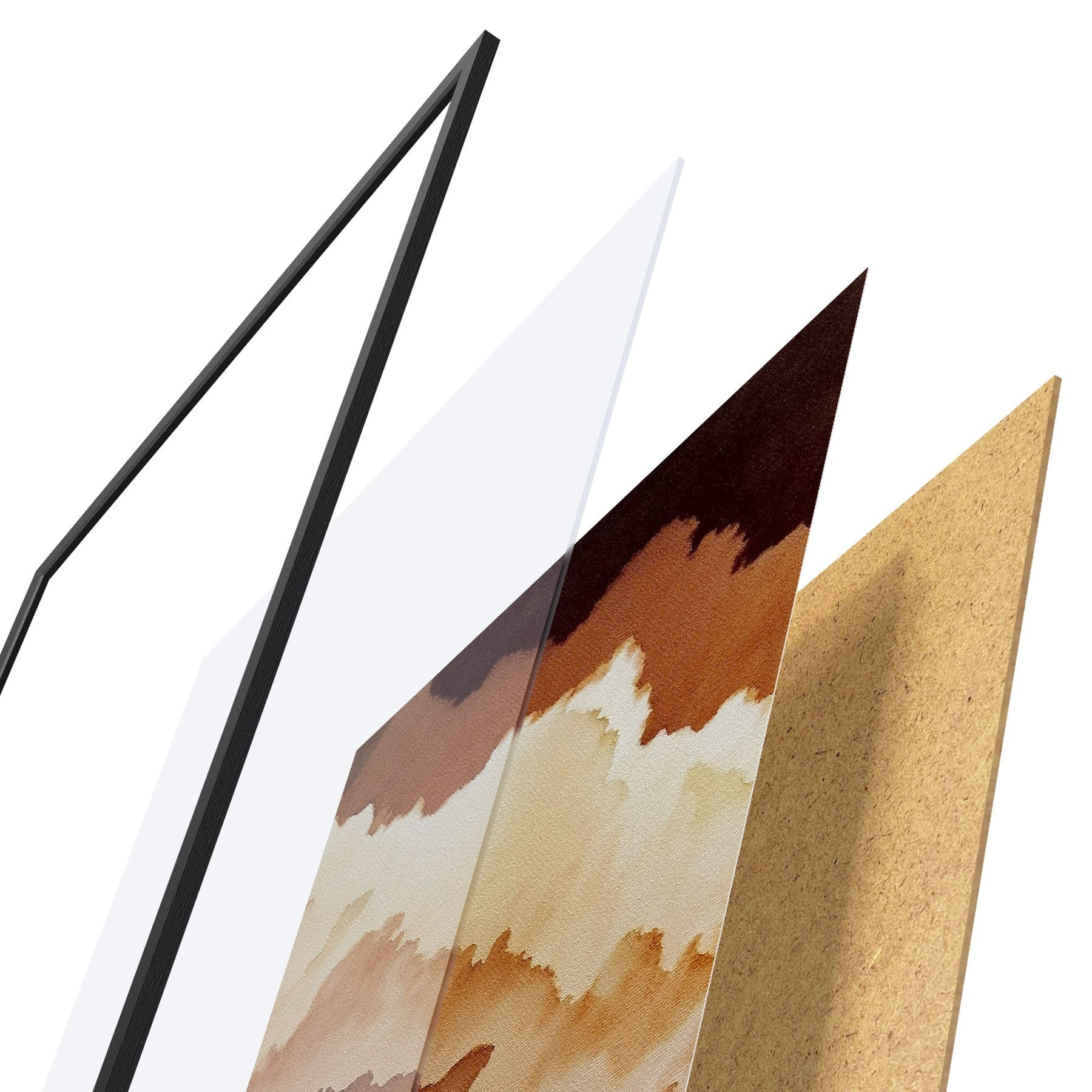 De poster bestaat uit een frame, plexiglas, geprinte afbeelding en spaanplaat achterkant. De poster kan meteen aan de muur worden gehangen dankzij de bevestigingen op de achterkant.