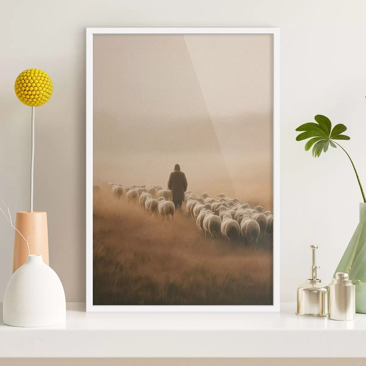Poster herder die met een kudde schapen in een open veld loopt N° f48077