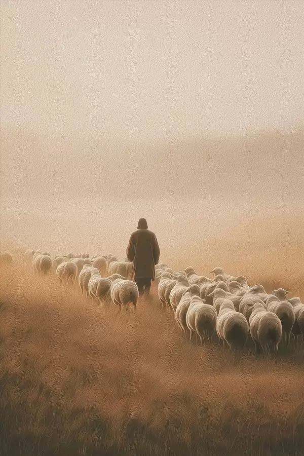 Poster herder die met een kudde schapen in een open veld loopt N° f48077
