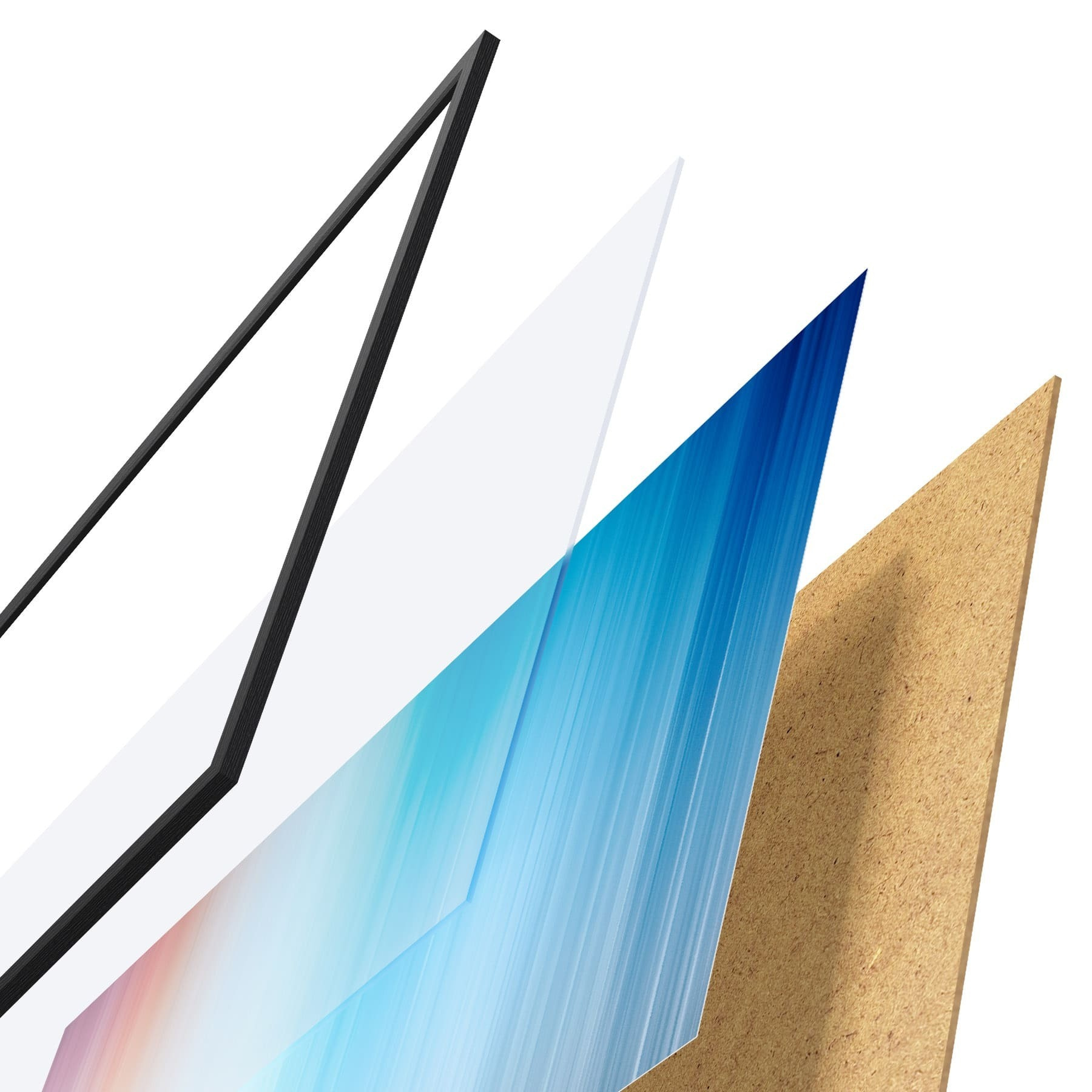 De poster bestaat uit een frame, plexiglas, geprinte afbeelding en spaanplaat achterkant. De poster kan meteen aan de muur worden gehangen dankzij de bevestigingen op de achterkant.