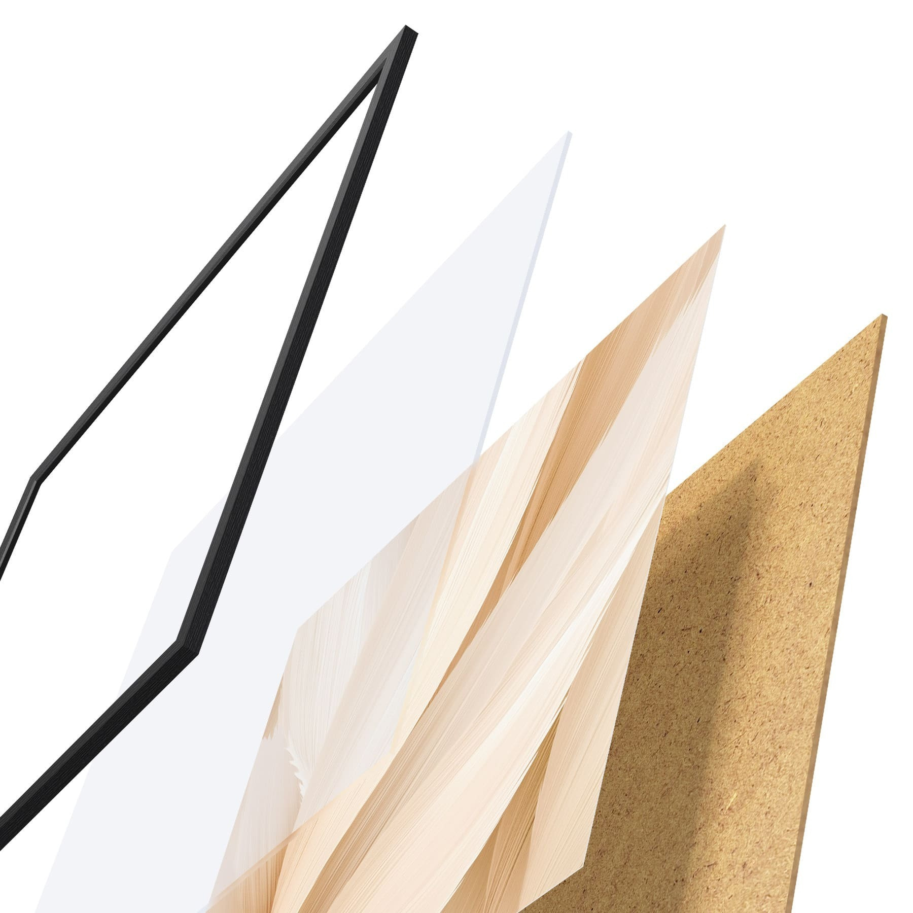 De poster bestaat uit een frame, plexiglas, geprinte afbeelding en spaanplaat achterkant. De poster kan meteen aan de muur worden gehangen dankzij de bevestigingen op de achterkant.