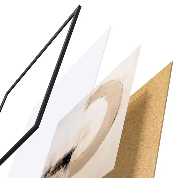 De poster bestaat uit een frame, plexiglas, geprinte afbeelding en spaanplaat achterkant. De poster kan meteen aan de muur worden gehangen dankzij de bevestigingen op de achterkant.