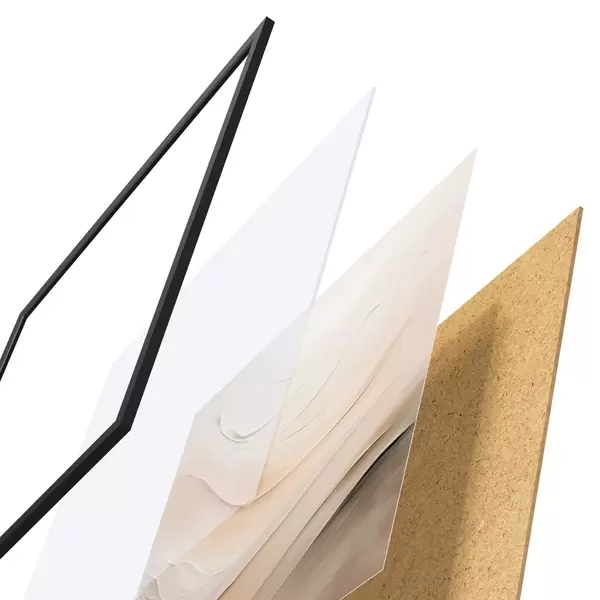 De poster bestaat uit een frame, plexiglas, geprinte afbeelding en spaanplaat achterkant. De poster kan meteen aan de muur worden gehangen dankzij de bevestigingen op de achterkant.