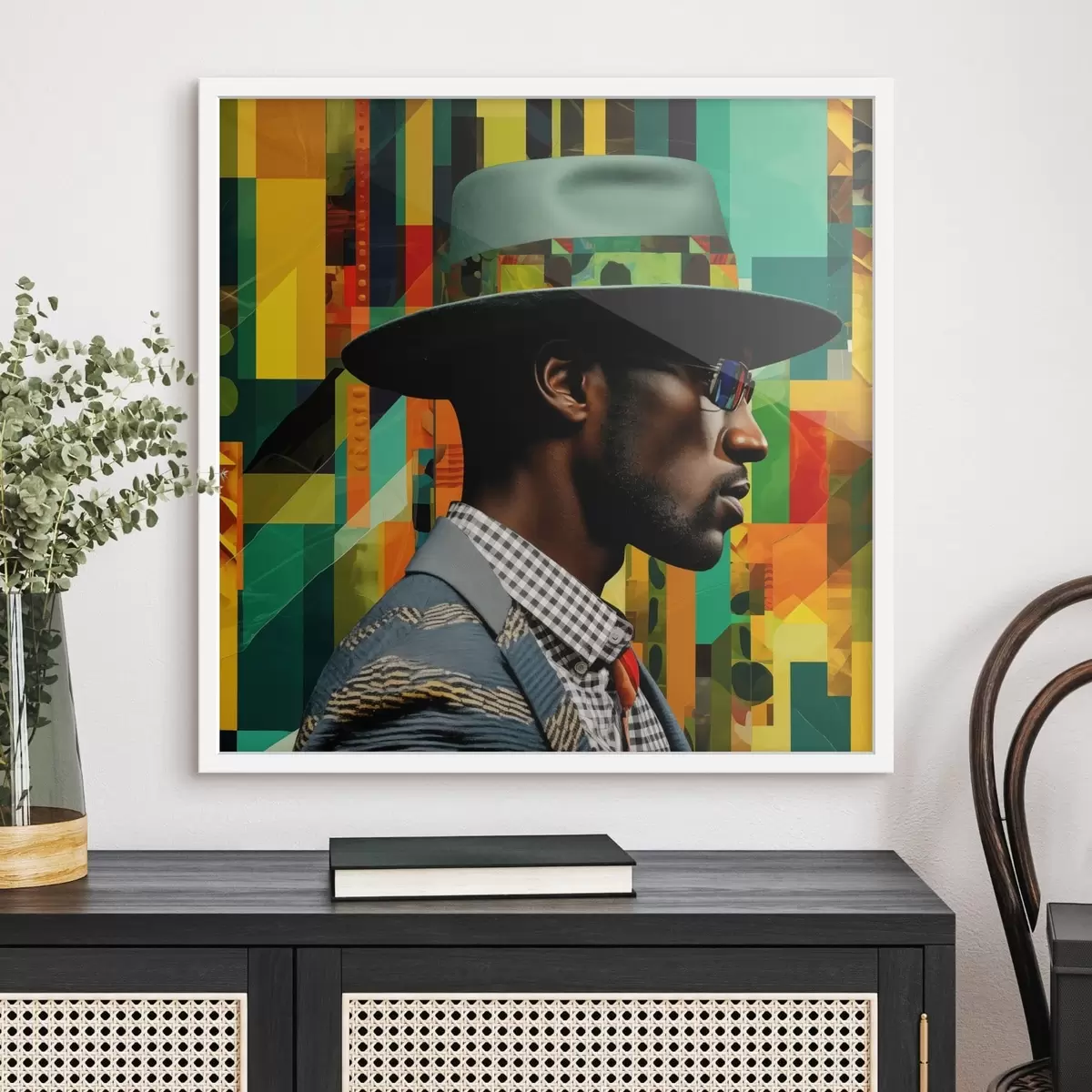 Poster Portret van een man met hoed tegen een levendige achtergrond f48100