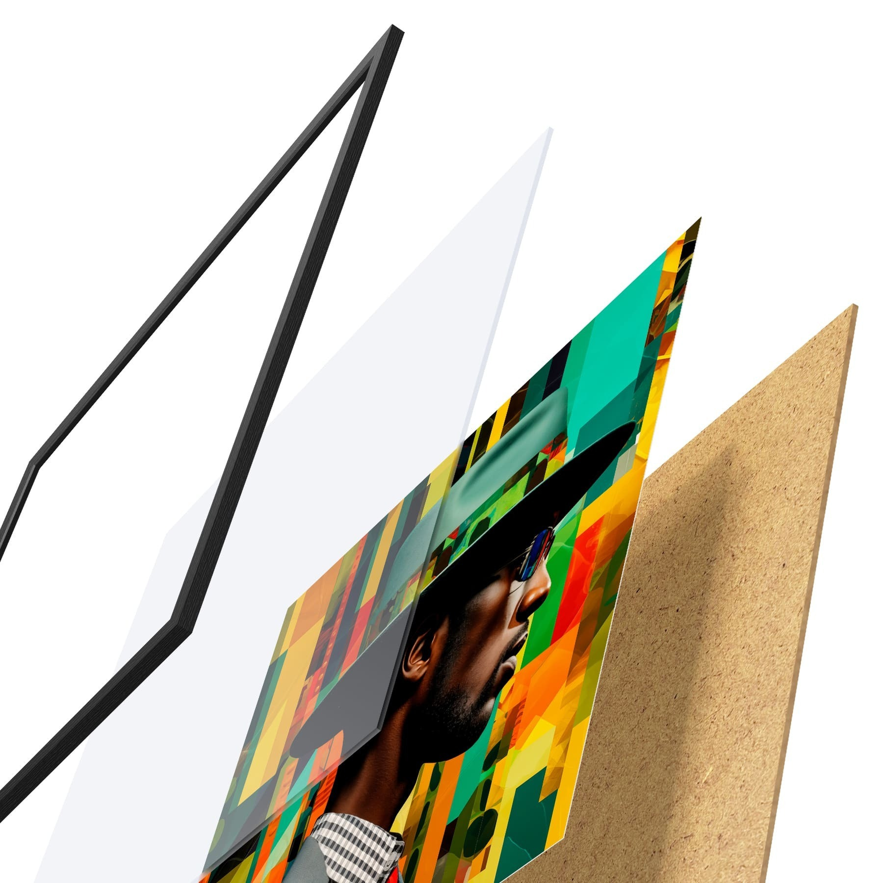 De poster bestaat uit een frame, plexiglas, geprinte afbeelding en spaanplaat achterkant. De poster kan meteen aan de muur worden gehangen dankzij de bevestigingen op de achterkant.