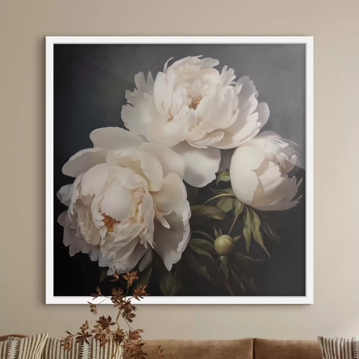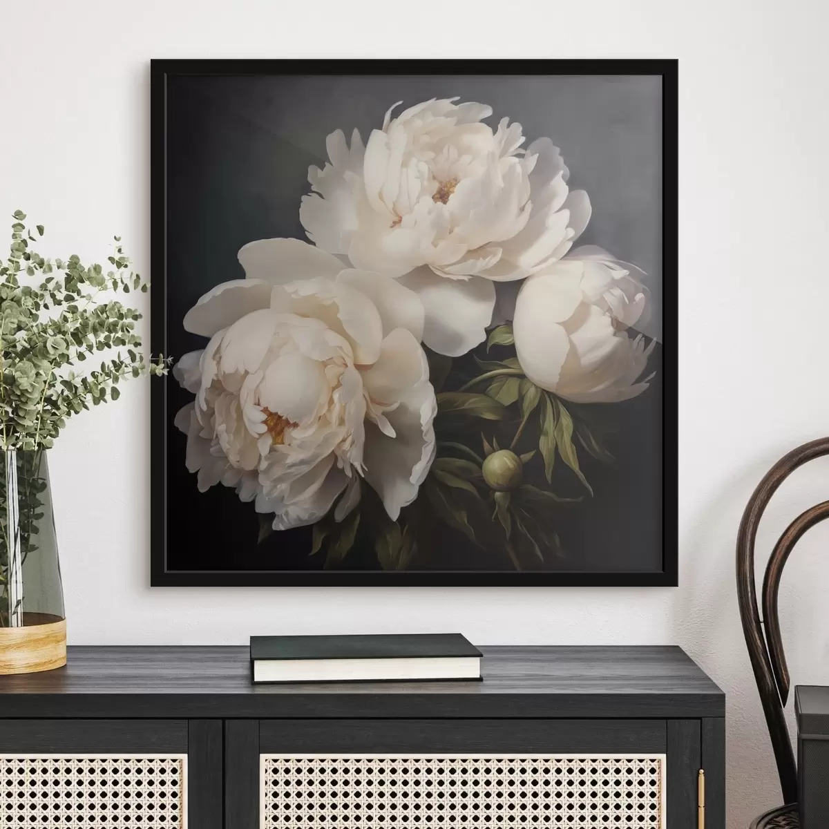 Poster Witte pioenrozen op donkere achtergrond N° f48101
