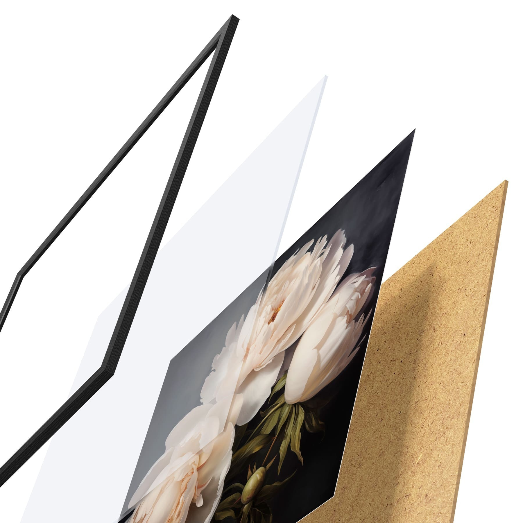 De poster bestaat uit een frame, plexiglas, geprinte afbeelding en spaanplaat achterkant. De poster kan meteen aan de muur worden gehangen dankzij de bevestigingen op de achterkant.