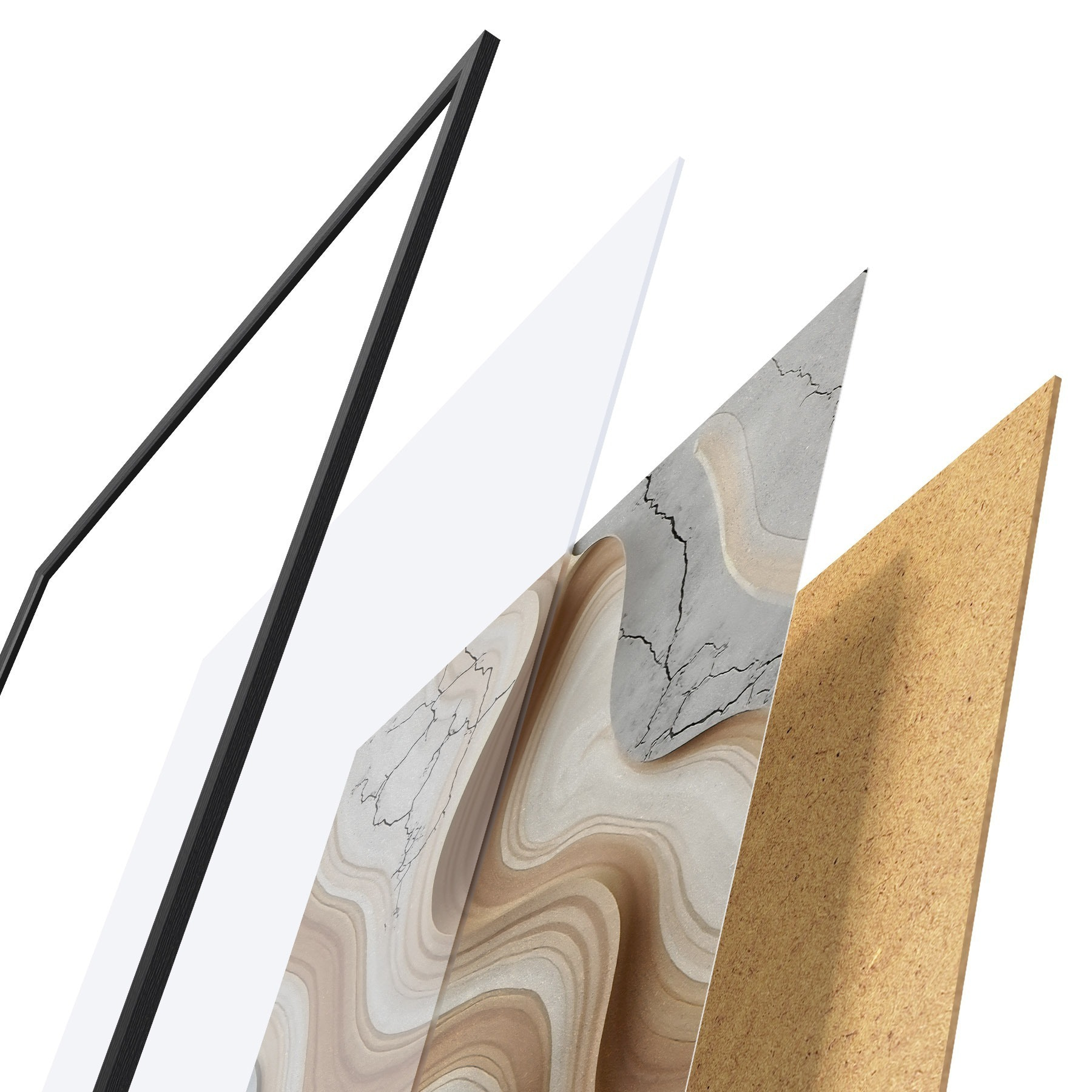 De poster bestaat uit een frame, plexiglas, geprinte afbeelding en spaanplaat achterkant. De poster kan meteen aan de muur worden gehangen dankzij de bevestigingen op de achterkant.