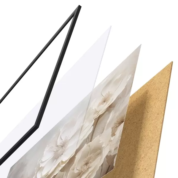 De poster bestaat uit een frame, plexiglas, geprinte afbeelding en spaanplaat achterkant. De poster kan meteen aan de muur worden gehangen dankzij de bevestigingen op de achterkant.