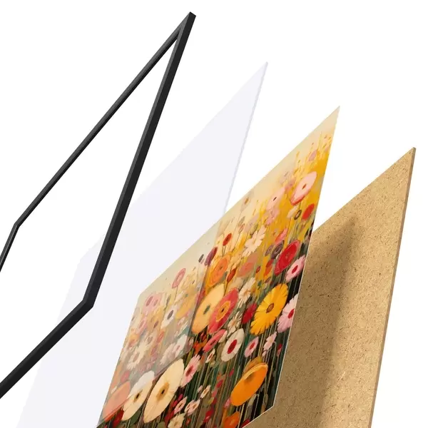 De poster bestaat uit een frame, plexiglas, geprinte afbeelding en spaanplaat achterkant. De poster kan meteen aan de muur worden gehangen dankzij de bevestigingen op de achterkant.