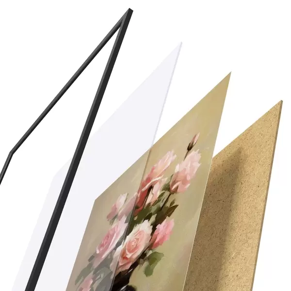 De poster bestaat uit een frame, plexiglas, geprinte afbeelding en spaanplaat achterkant. De poster kan meteen aan de muur worden gehangen dankzij de bevestigingen op de achterkant.