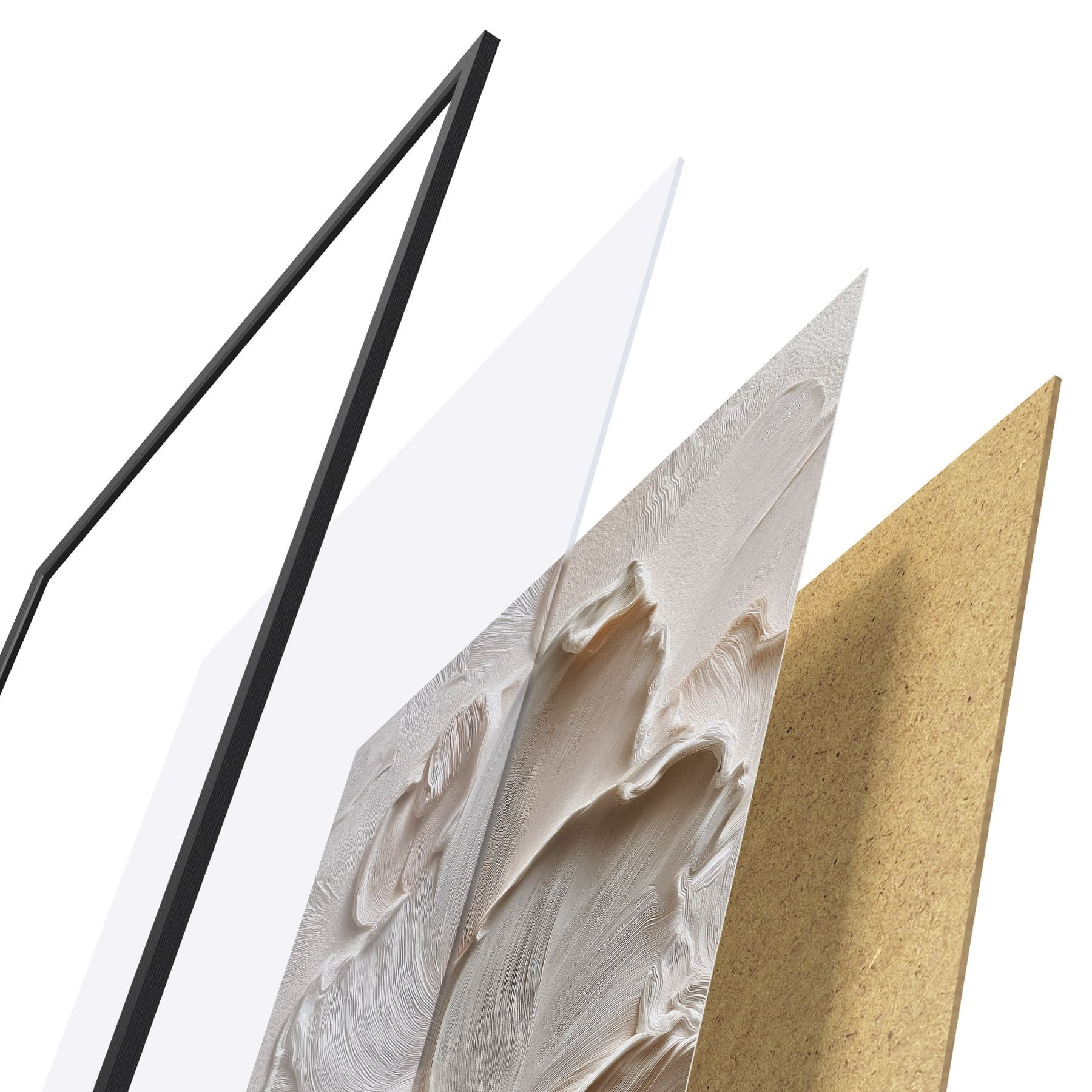 De poster bestaat uit een frame, plexiglas, geprinte afbeelding en spaanplaat achterkant. De poster kan meteen aan de muur worden gehangen dankzij de bevestigingen op de achterkant.
