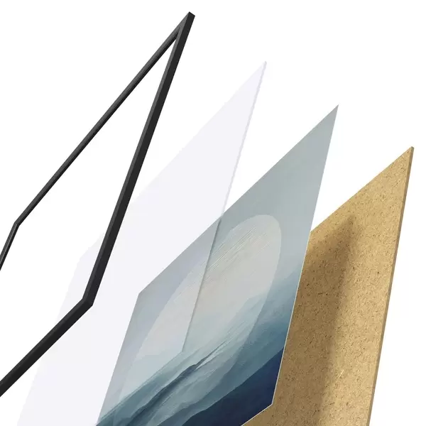 De poster bestaat uit een frame, plexiglas, geprinte afbeelding en spaanplaat achterkant. De poster kan meteen aan de muur worden gehangen dankzij de bevestigingen op de achterkant.