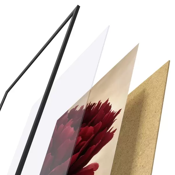De poster bestaat uit een frame, plexiglas, geprinte afbeelding en spaanplaat achterkant. De poster kan meteen aan de muur worden gehangen dankzij de bevestigingen op de achterkant.