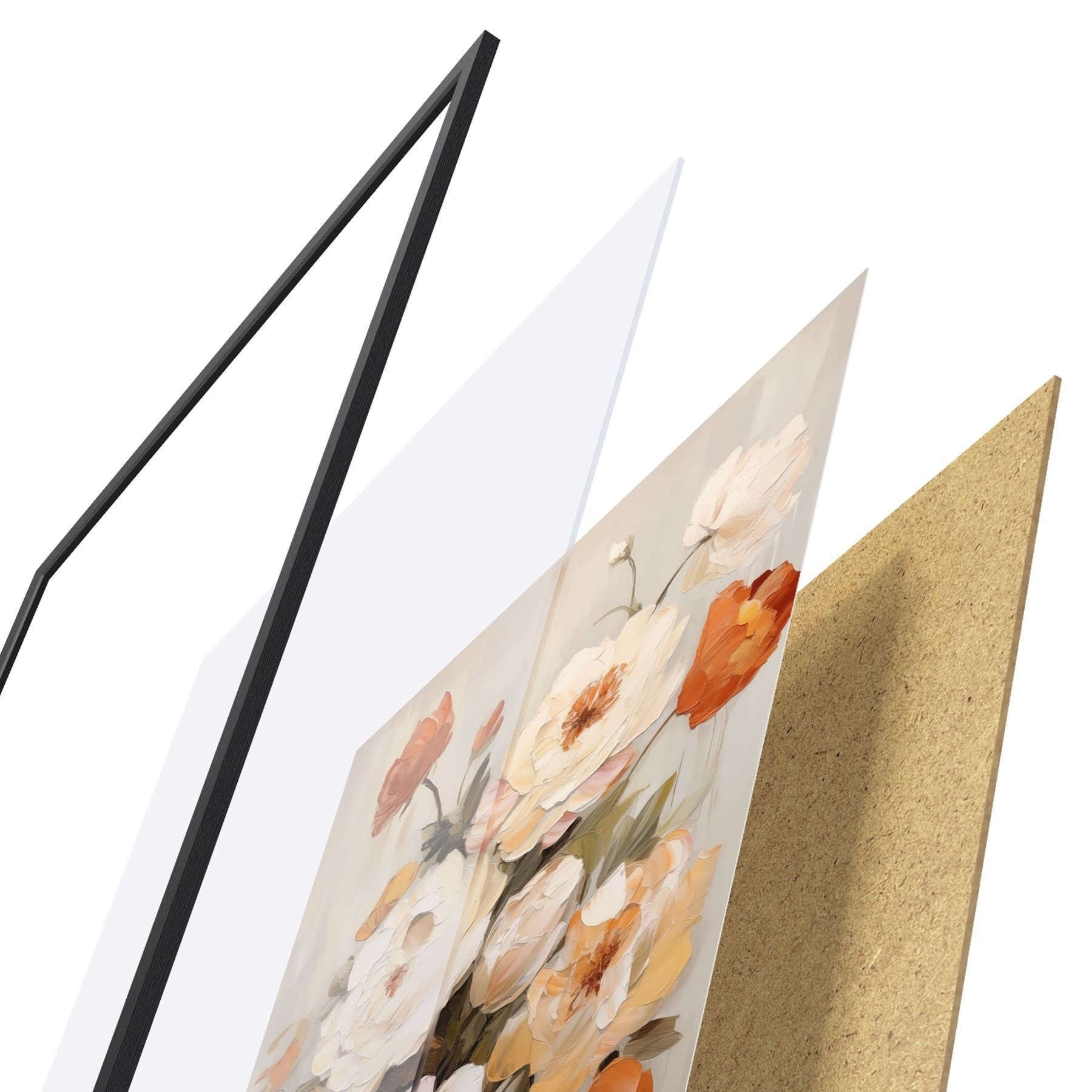 De poster bestaat uit een frame, plexiglas, geprinte afbeelding en spaanplaat achterkant. De poster kan meteen aan de muur worden gehangen dankzij de bevestigingen op de achterkant.