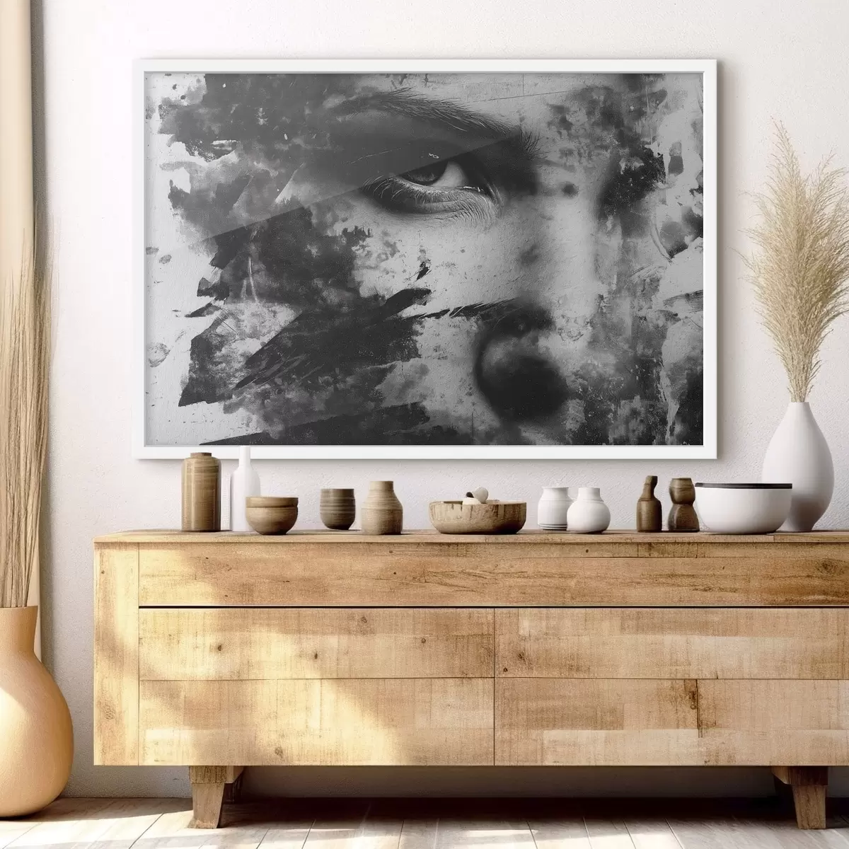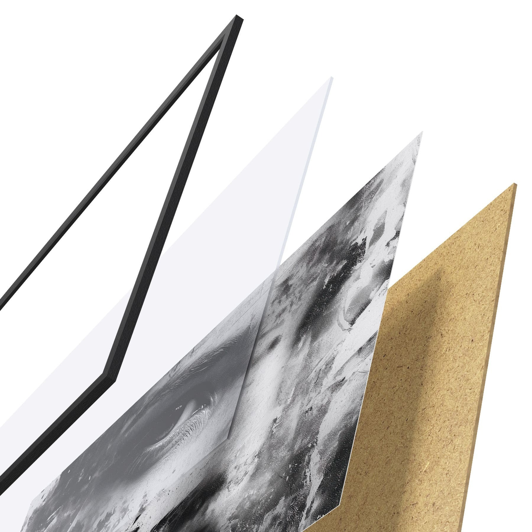 De poster bestaat uit een frame, plexiglas, geprinte afbeelding en spaanplaat achterkant. De poster kan meteen aan de muur worden gehangen dankzij de bevestigingen op de achterkant.