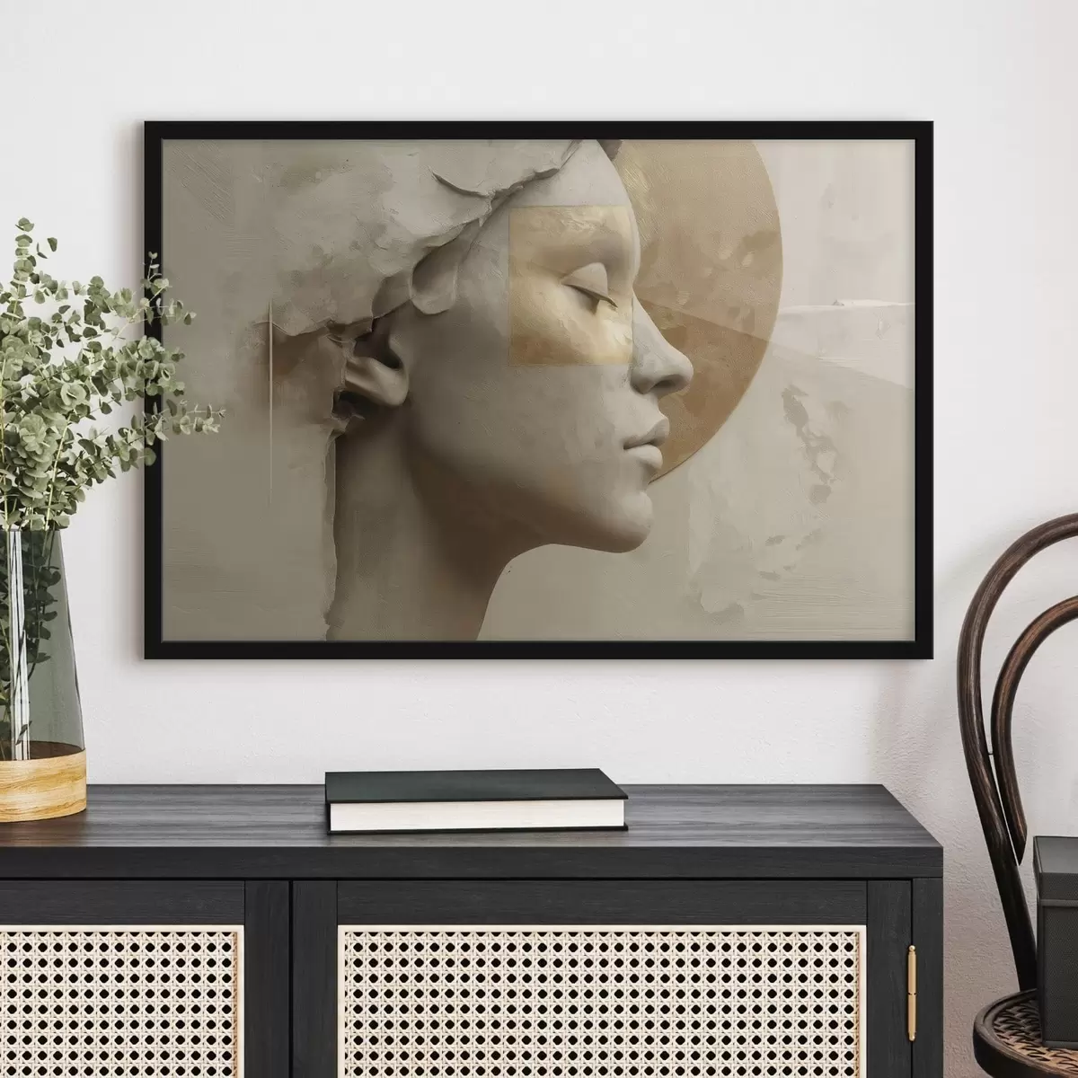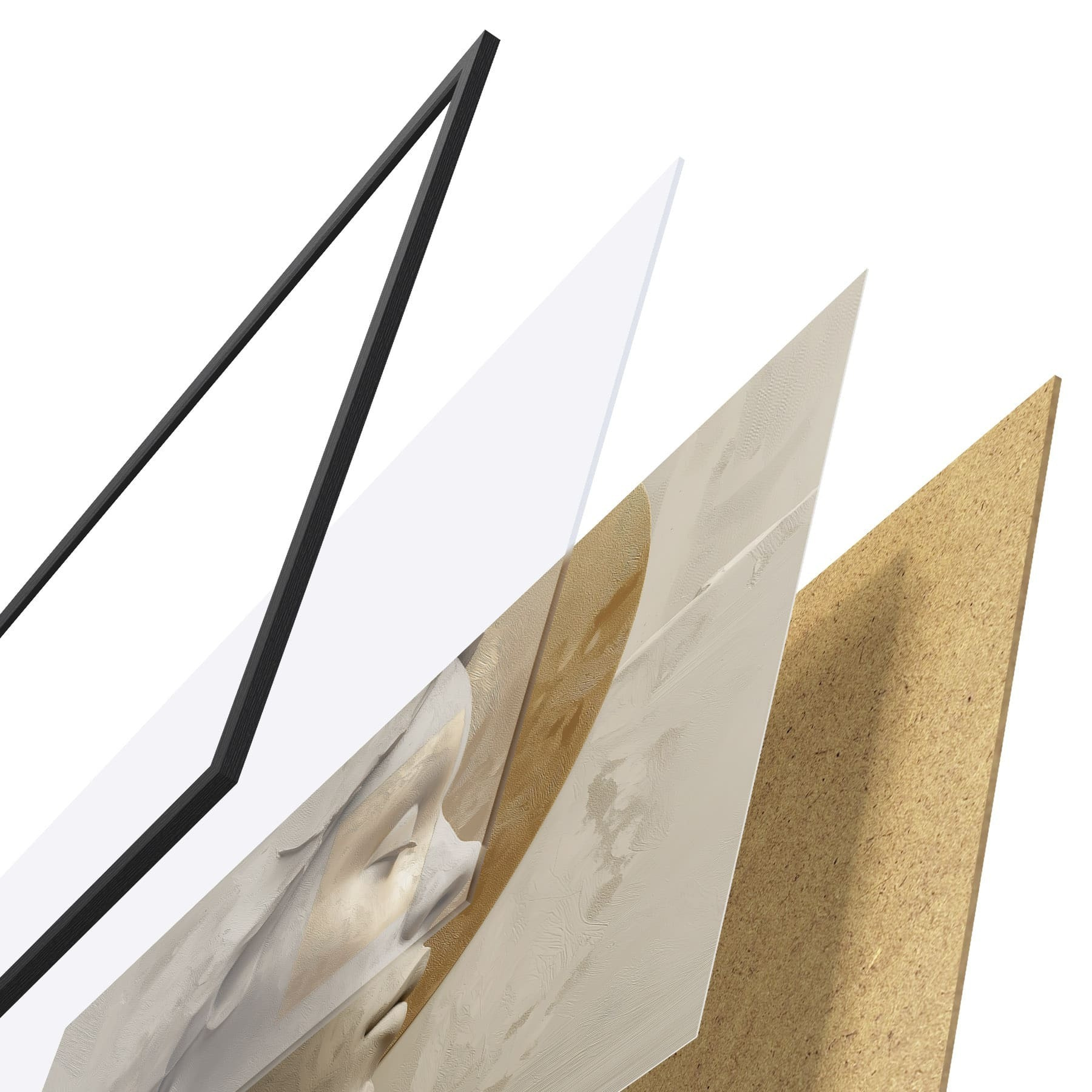 De poster bestaat uit een frame, plexiglas, geprinte afbeelding en spaanplaat achterkant. De poster kan meteen aan de muur worden gehangen dankzij de bevestigingen op de achterkant.
