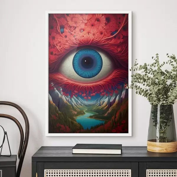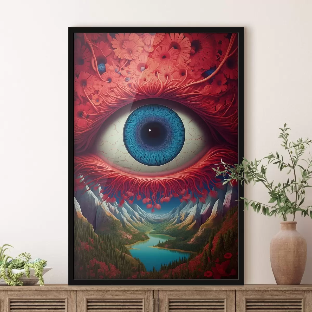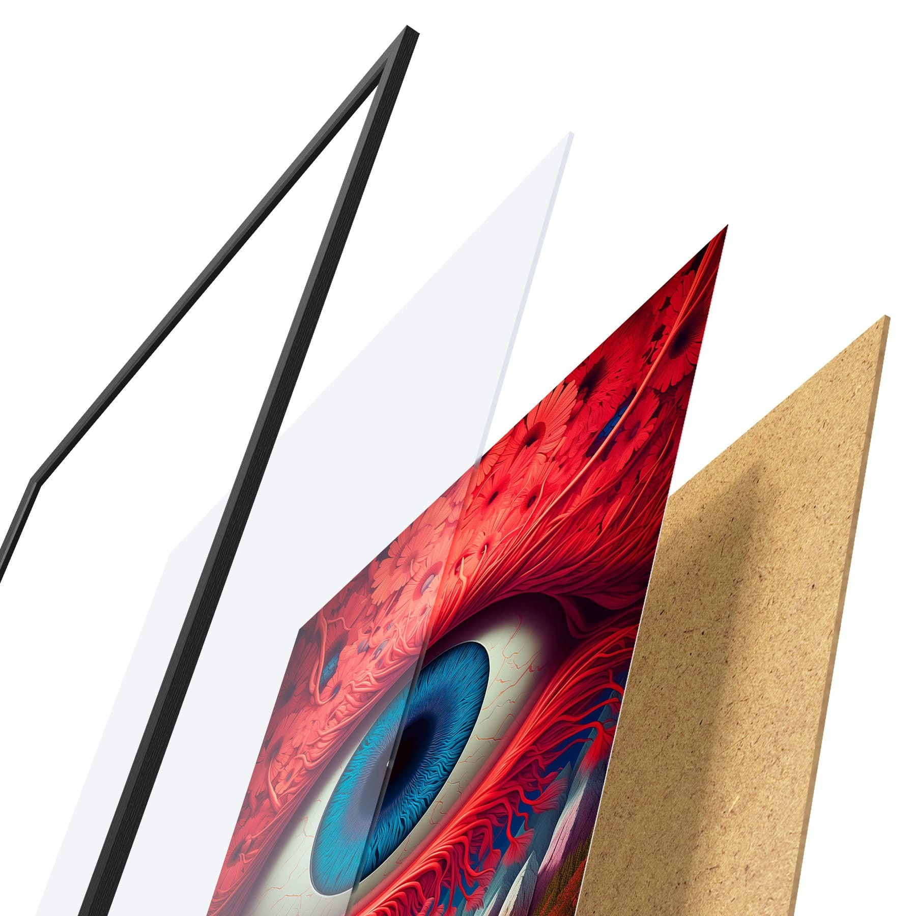 De poster bestaat uit een frame, plexiglas, geprinte afbeelding en spaanplaat achterkant. De poster kan meteen aan de muur worden gehangen dankzij de bevestigingen op de achterkant.