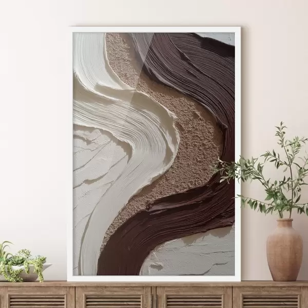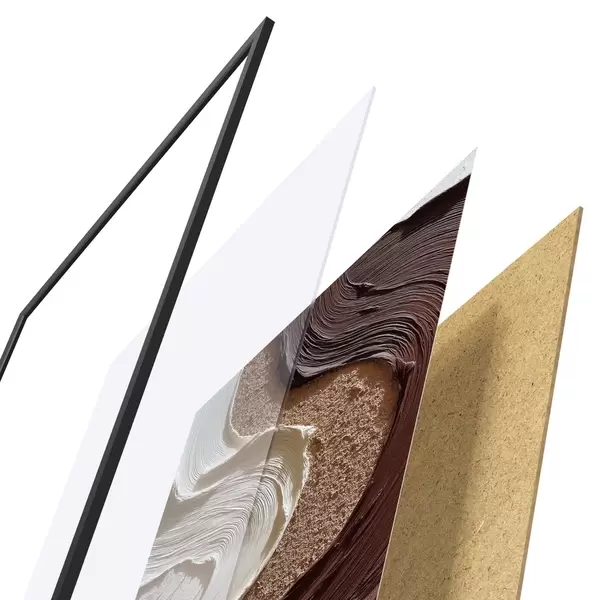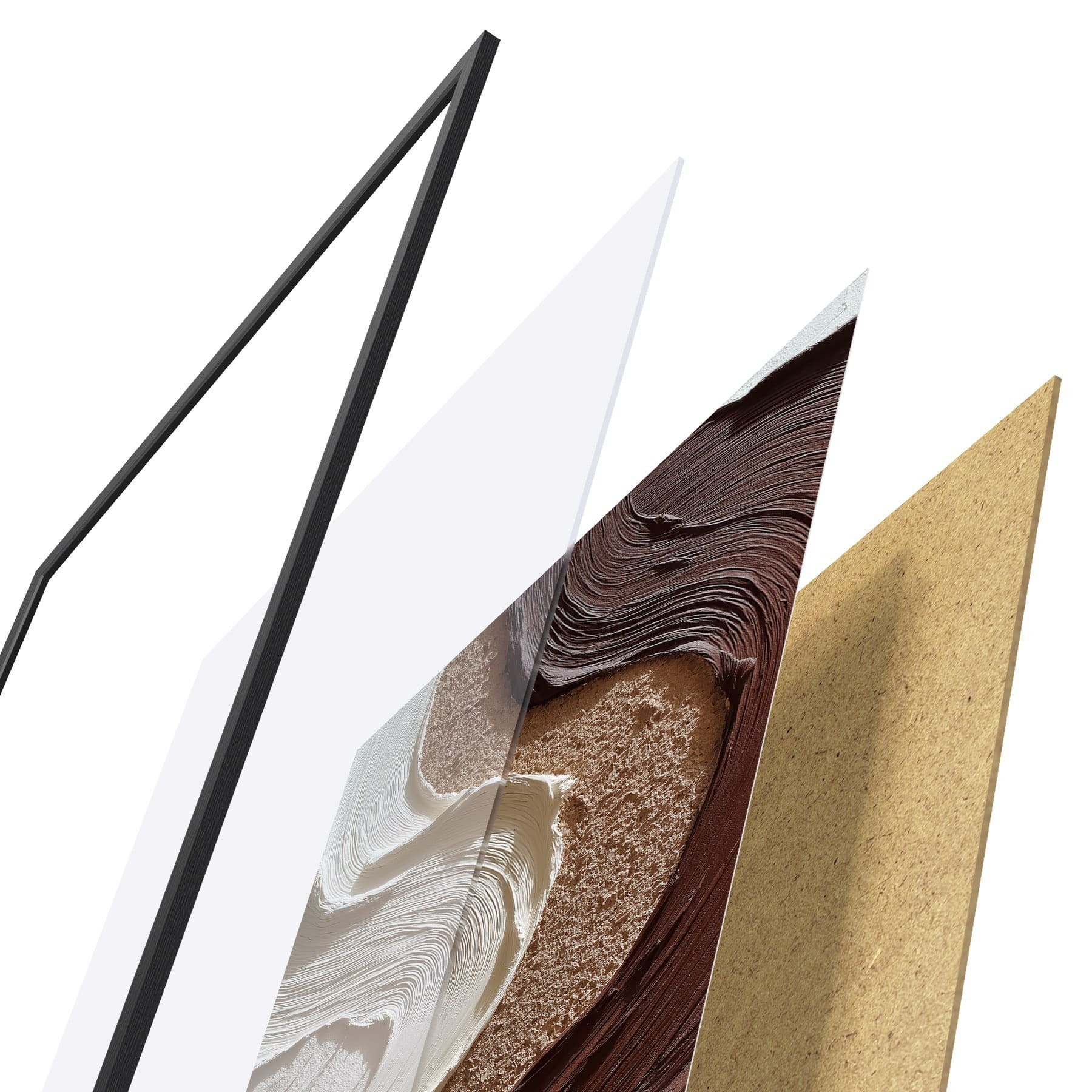 De poster bestaat uit een frame, plexiglas, geprinte afbeelding en spaanplaat achterkant. De poster kan meteen aan de muur worden gehangen dankzij de bevestigingen op de achterkant.