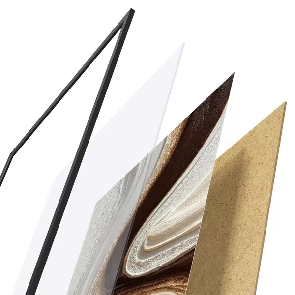 De poster bestaat uit een frame, plexiglas, geprinte afbeelding en spaanplaat achterkant. De poster kan meteen aan de muur worden gehangen dankzij de bevestigingen op de achterkant.