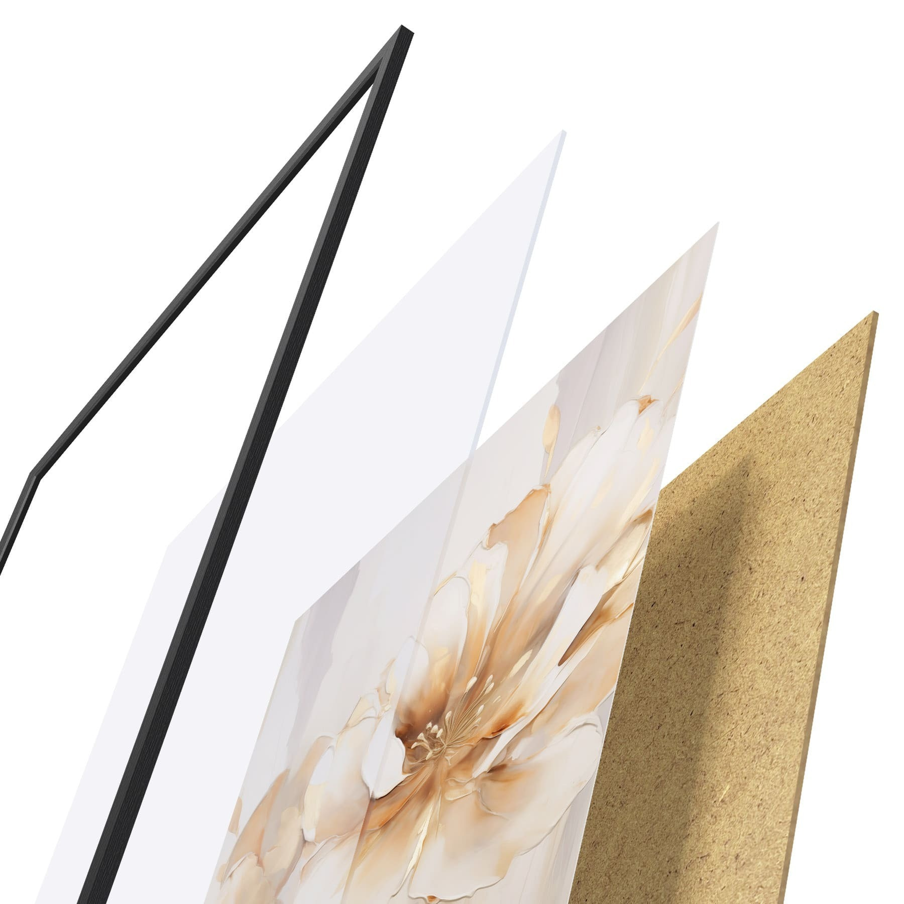 De poster bestaat uit een frame, plexiglas, geprinte afbeelding en spaanplaat achterkant. De poster kan meteen aan de muur worden gehangen dankzij de bevestigingen op de achterkant.